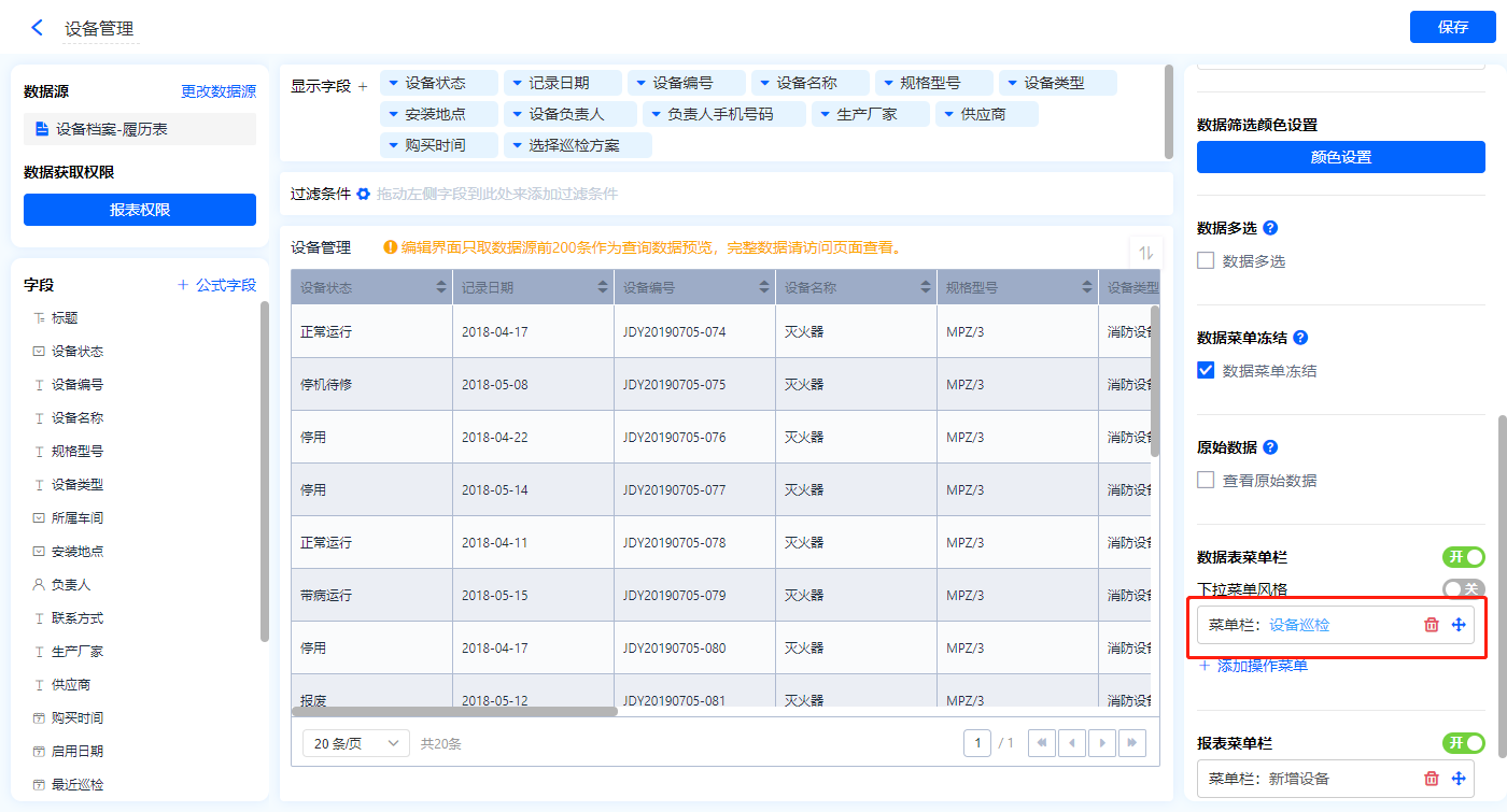 1)新增【设备管理】报表,用基础报表【数据表】展示数据源为表单【设备档案-履历表】的数据;