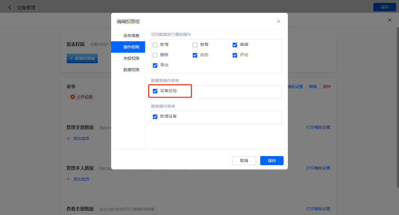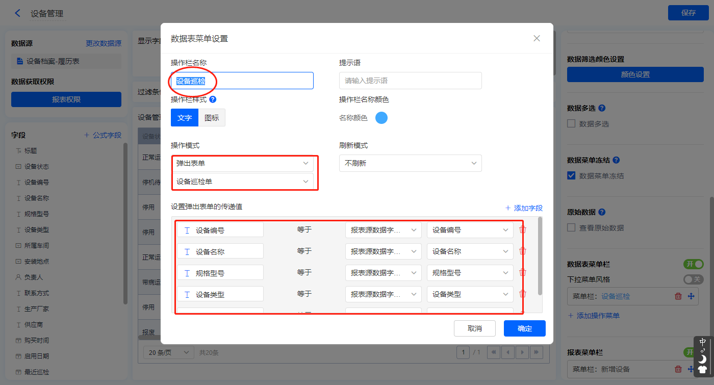 【设备巡检】的菜单栏,操作模式设置为弹出表单【设备巡检单】;