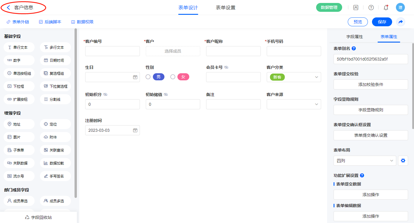 2.2、表单【客户信息】字段及表单属性设置