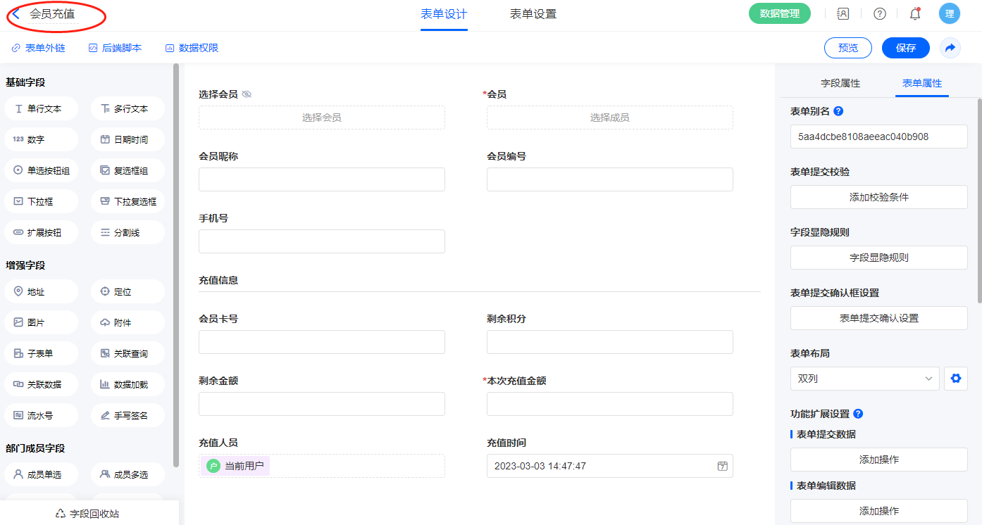 2.3、表单【会员充值】字段及表单属性设置