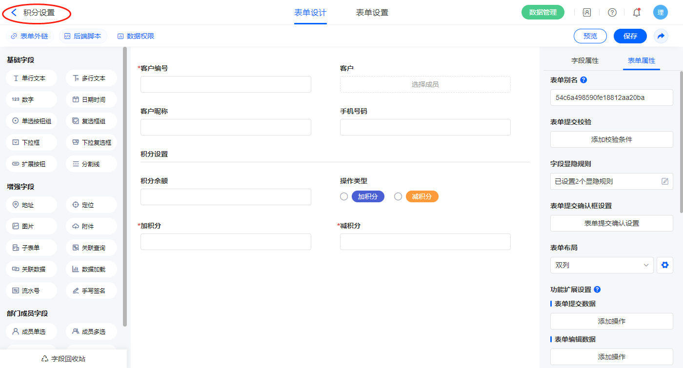 2.4、表单【积分设置】字段及表单属性设置