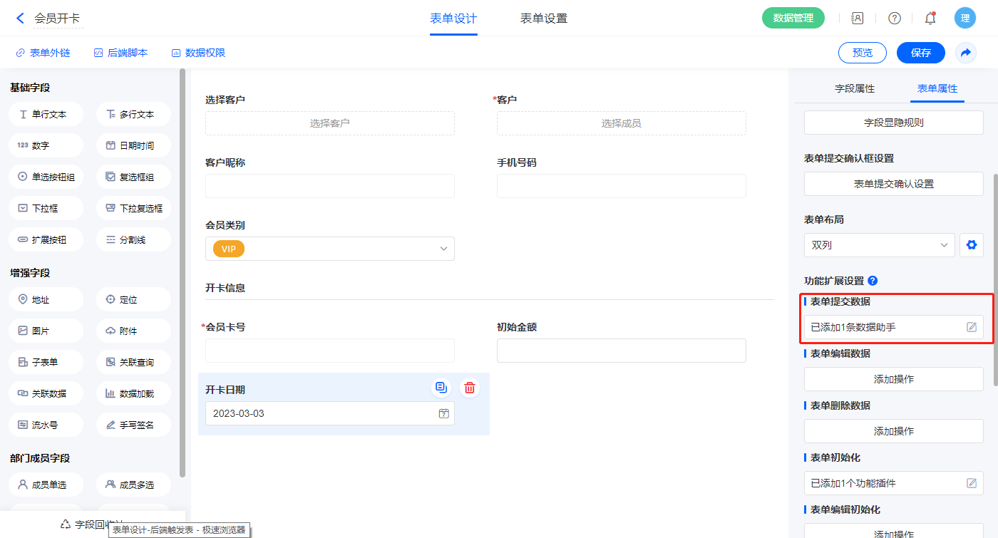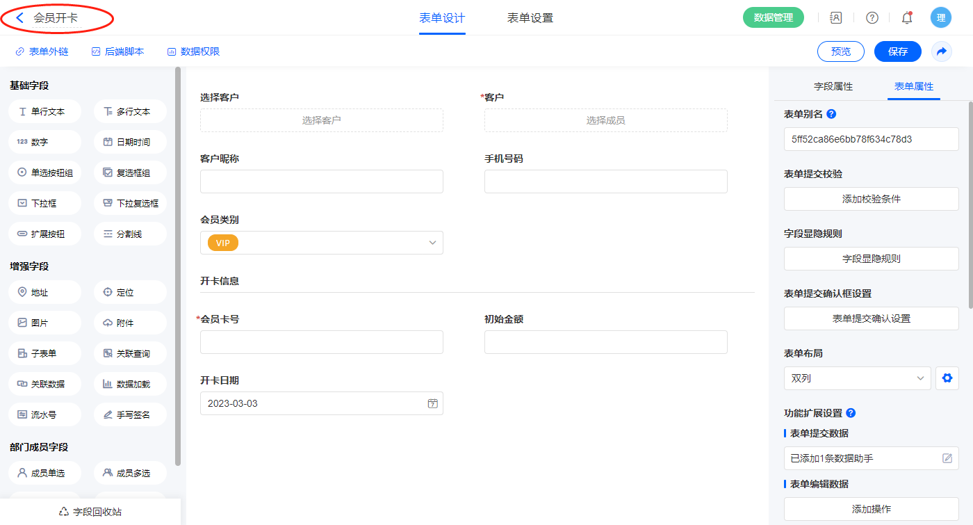 2.5、表单【会员开卡】字段及表单属性设置