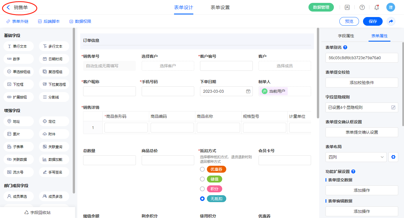2.6、表单【销售单】字段及表单属性设置