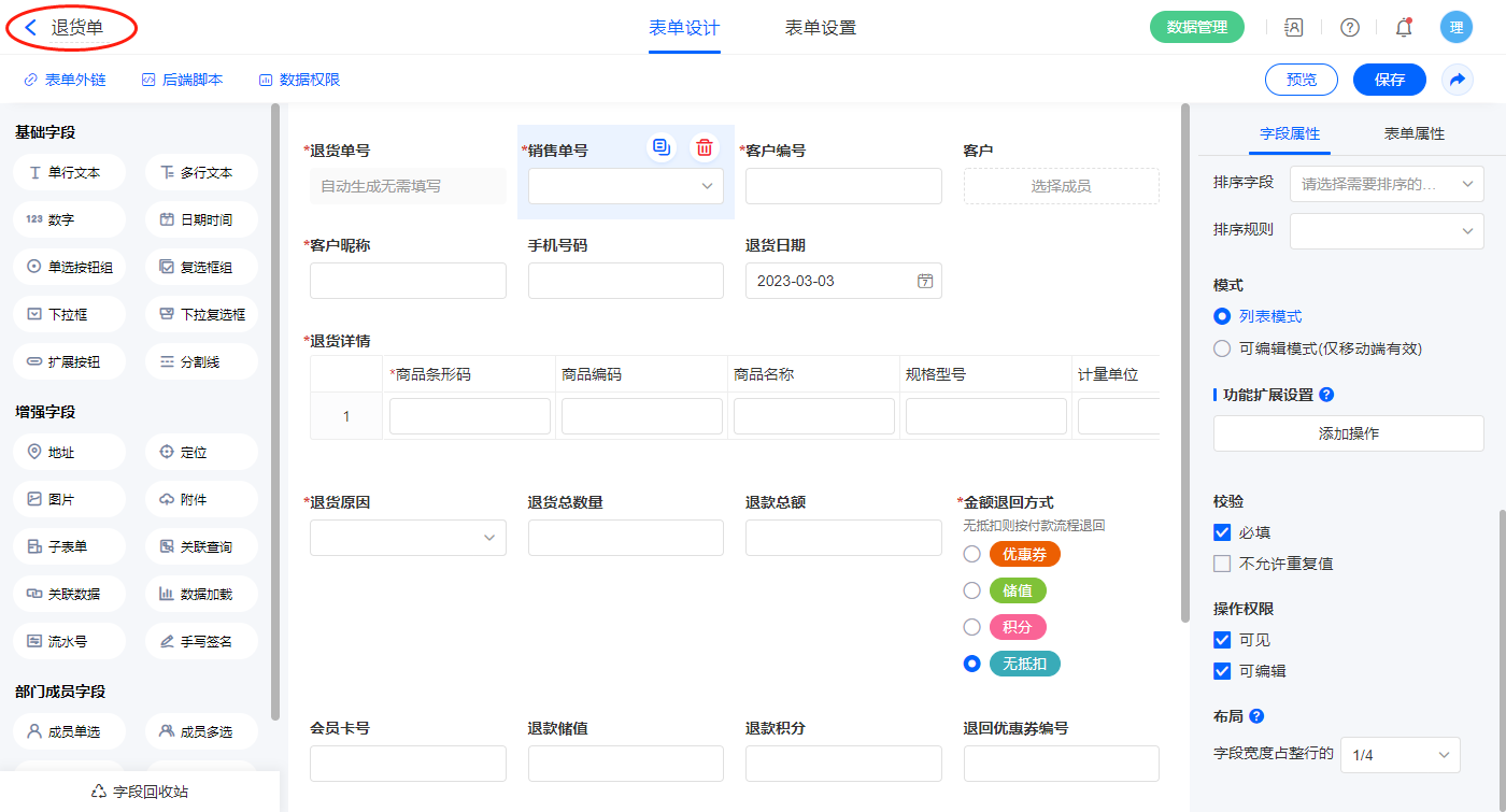 6)新增表单【退货单】,字段设置如下;