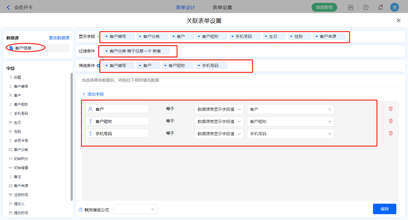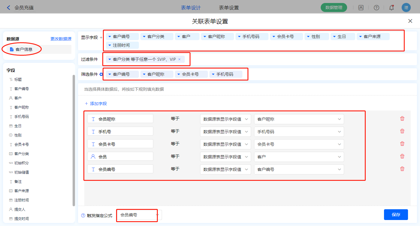 1)【选择会员】数据加载字段,数据源为【客户信息】,添加过滤条件及设置赋值字段,触发公式为【会员编号】字段;