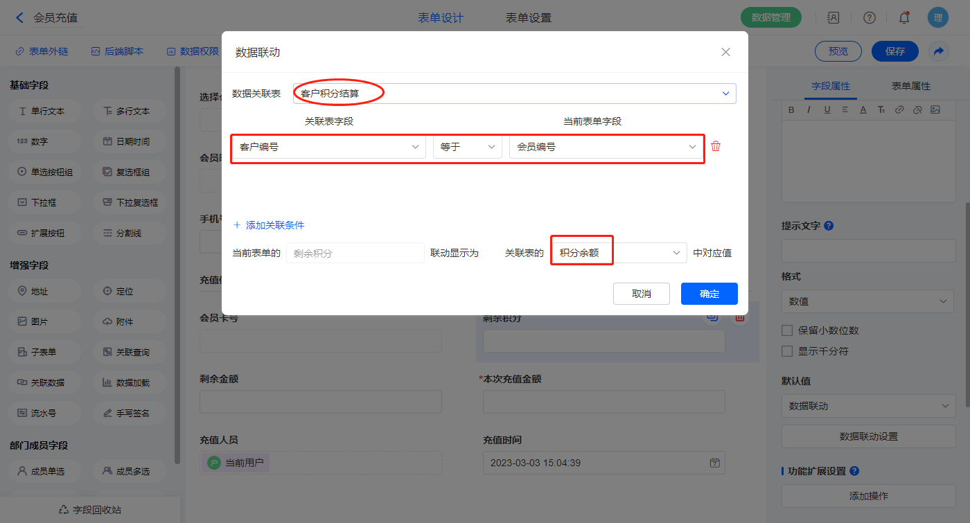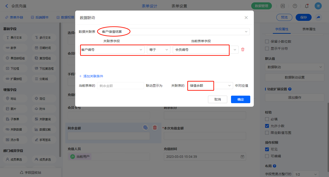 【储值余额】字段,设置默认值为数据联动,设置联动条件及联动字段;