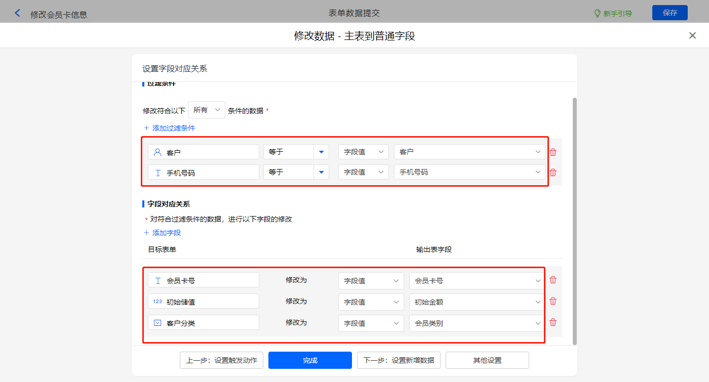 新增修改数据的执行动作,选择修改【客户信息】表单,选择对应过滤条件,以及需要修改的字段,设置好点击【完成】并保存该数据助手;