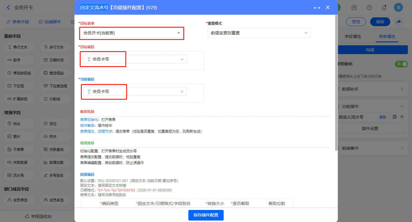 选择目标字段为【会员卡号】,设置编码规则点击保存;