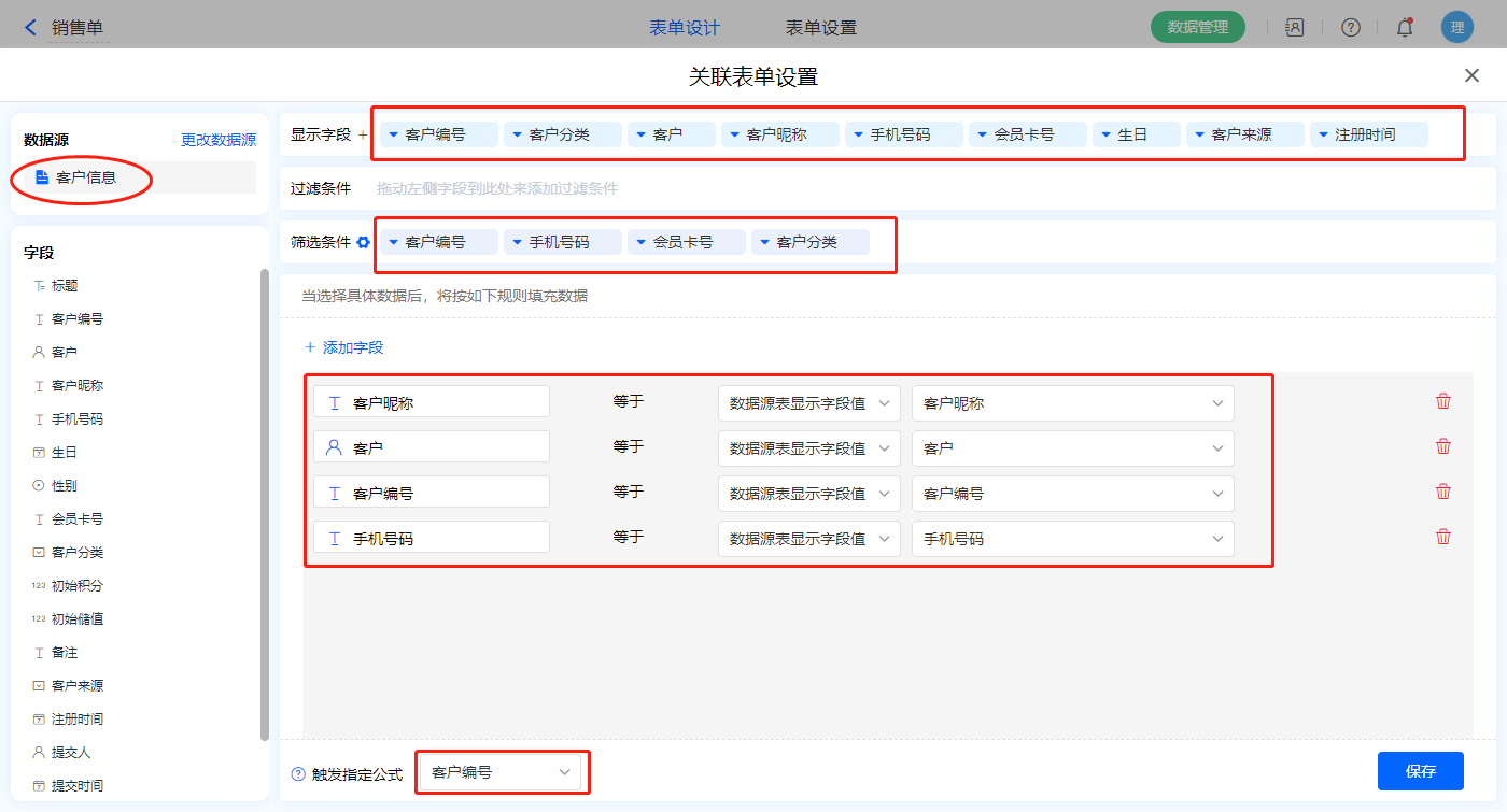 1)【选择客户】数据加载字段,数据源为【客户信息】,添加过滤条件及设置赋值字段,触发公式为【客户编号】字段;