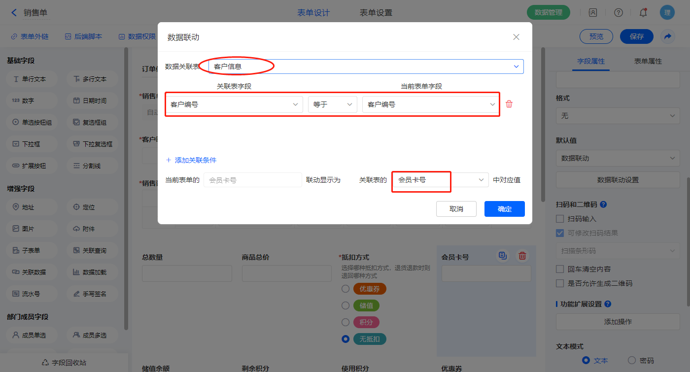 2)【会员卡号】字段,设置默认值为数据联动,设置联动条件及联动字段;
