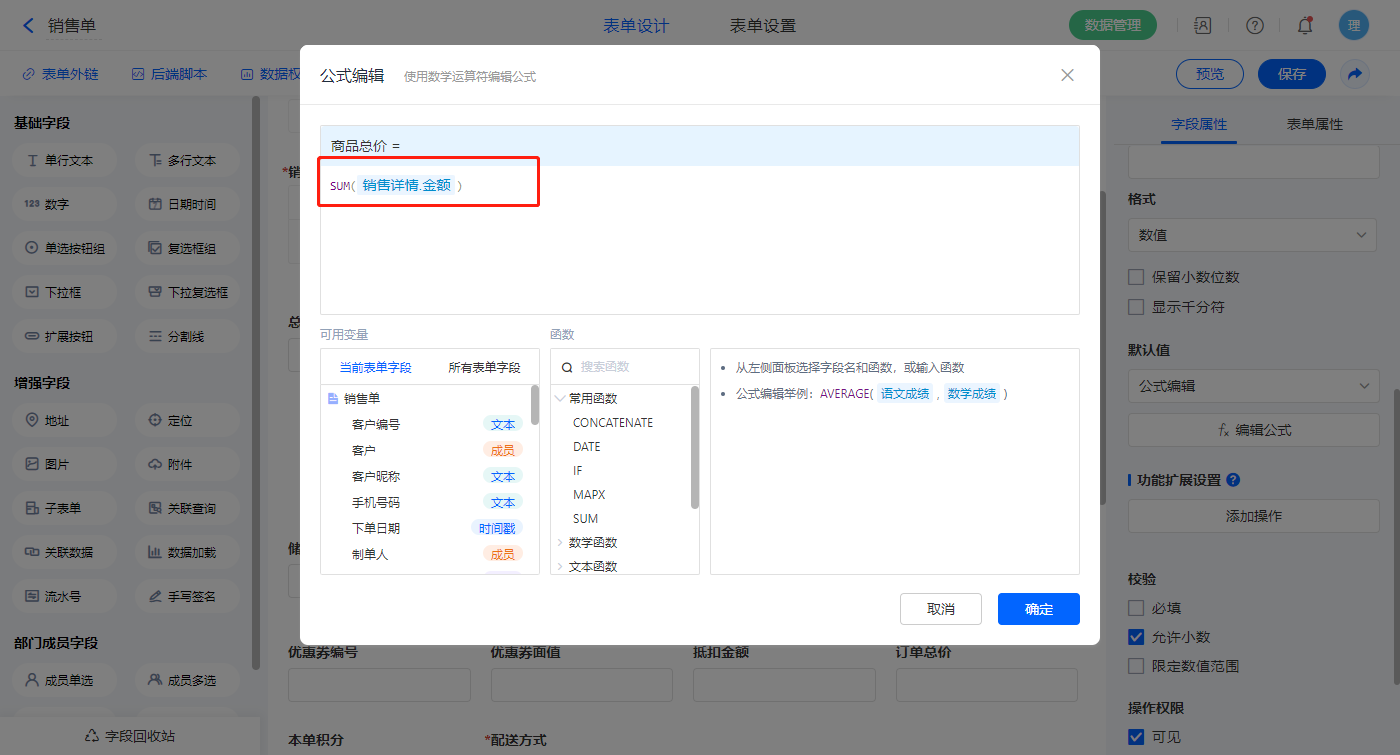 3)【销售详情.金额】字段,设置默认值为公式编辑,如图设置公式;
