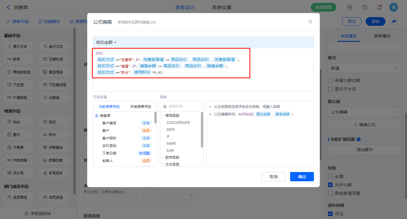 【抵扣金额】字段,设置默认值为公式编辑,如图设置公式;