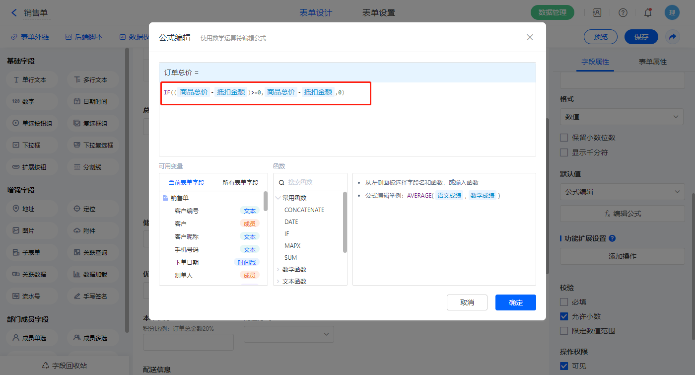【订单总价】字段,设置默认值为公式编辑,如图设置公式;