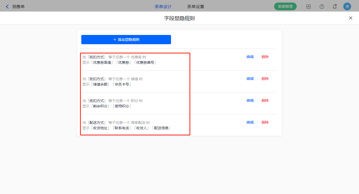 4)设置四条显隐规则,当【抵扣方式】字段等于优惠券显示【优惠券面值】、【优惠券】、【优惠券编号】字段,当【抵扣方式】字段等于储值显示【储值余额】、【会员卡号】字段,当【抵扣方式】字段等于积分显示【剩余积分】、【使用积分】字段,当【配送方式】字段等于商家配送显示【收货地址】、【配送信息】、【收货人】字段;