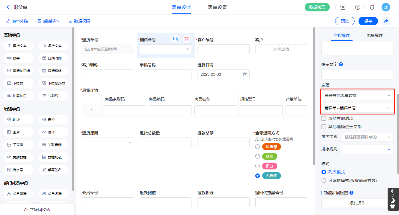 1)【销售单号】字段,选择设置为关联其他表单数据,关联销售单的【销售单号】字段;