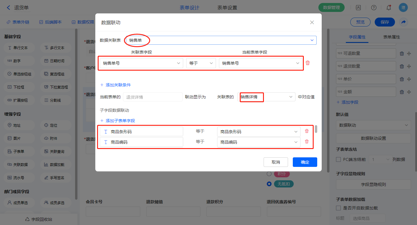 【退货详情】子表单字段,设置默认值为数据联动,设置联动条件及联动字段;