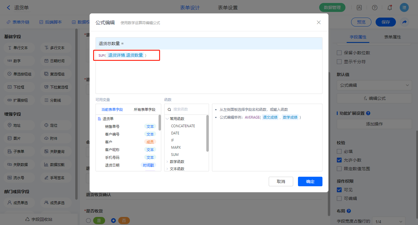 【退货总数量】字段,设置默认值为公式编辑,如图设置公式;