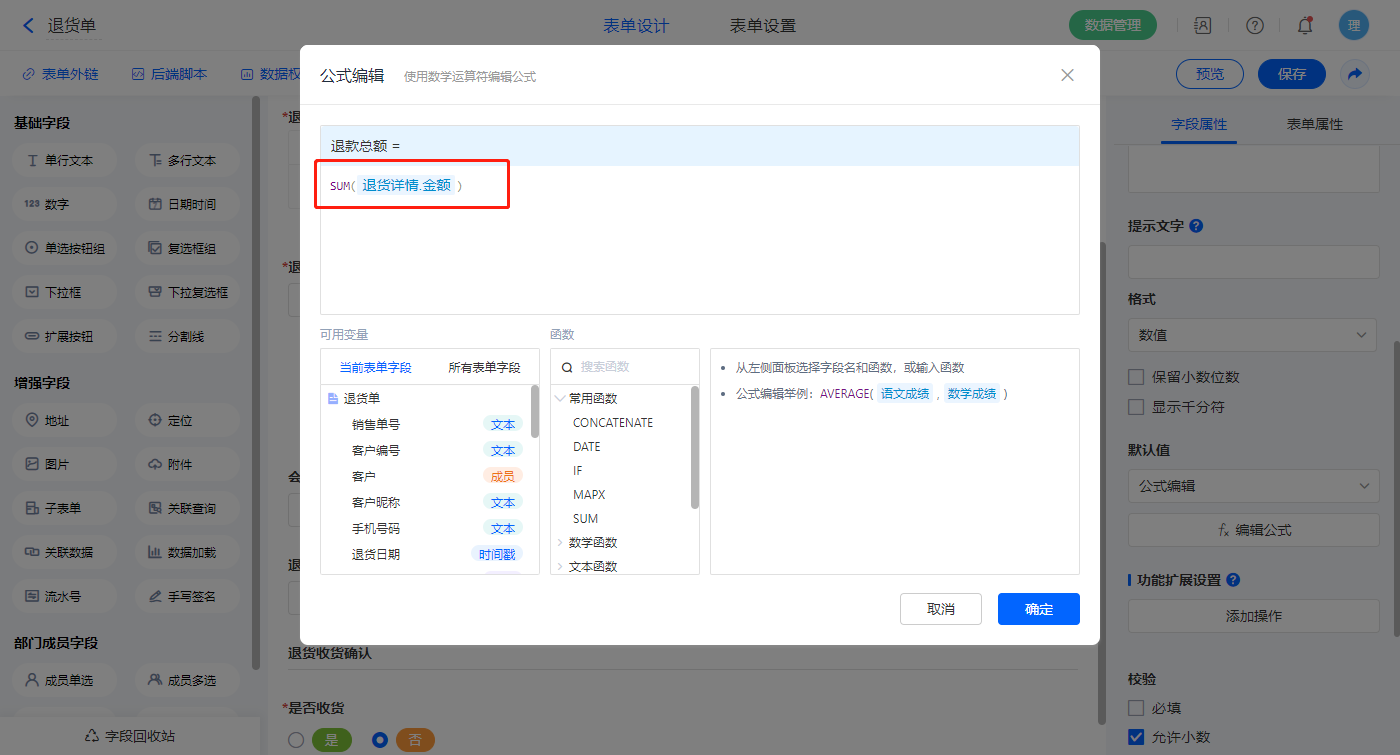 【退款金额】字段,设置默认值为公式编辑,如图设置公式;