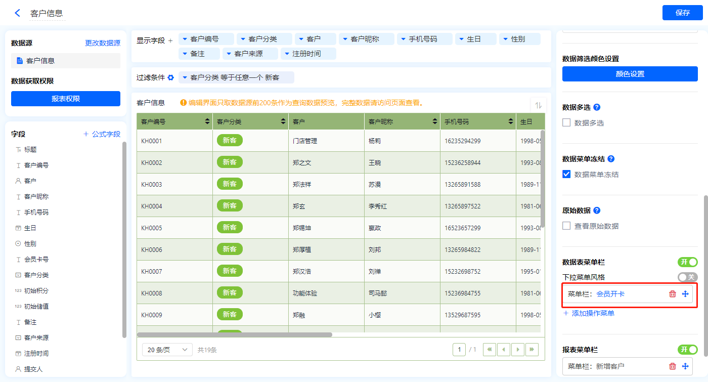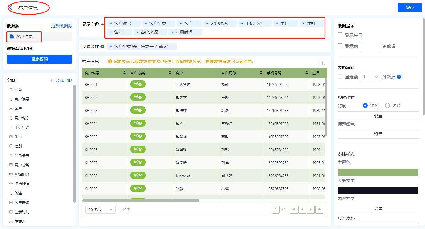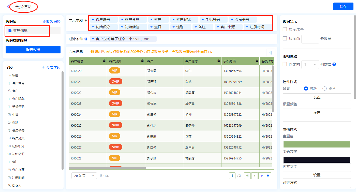 1)新增【会员资料】报表,用基础报表【数据表】展示数据源为表单【客户信息】的数据;
