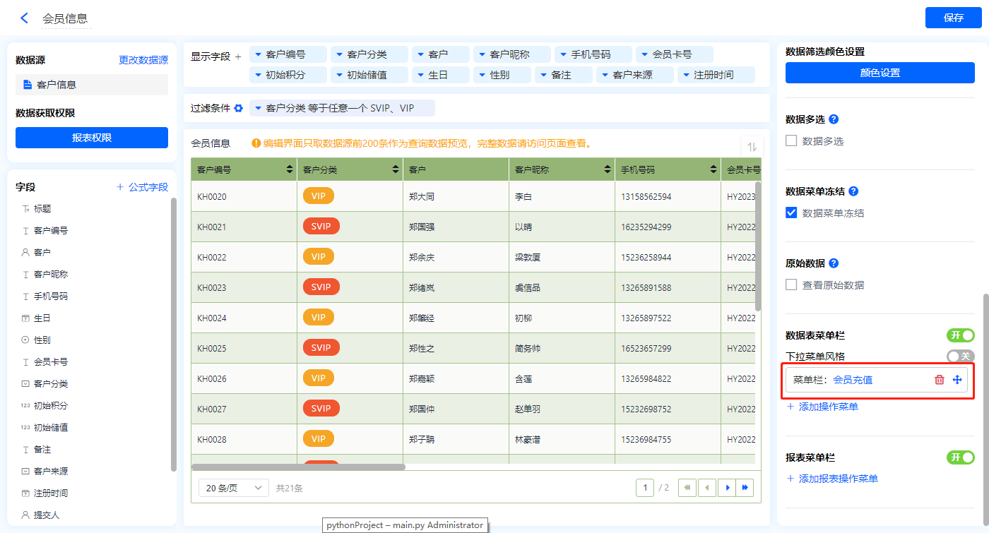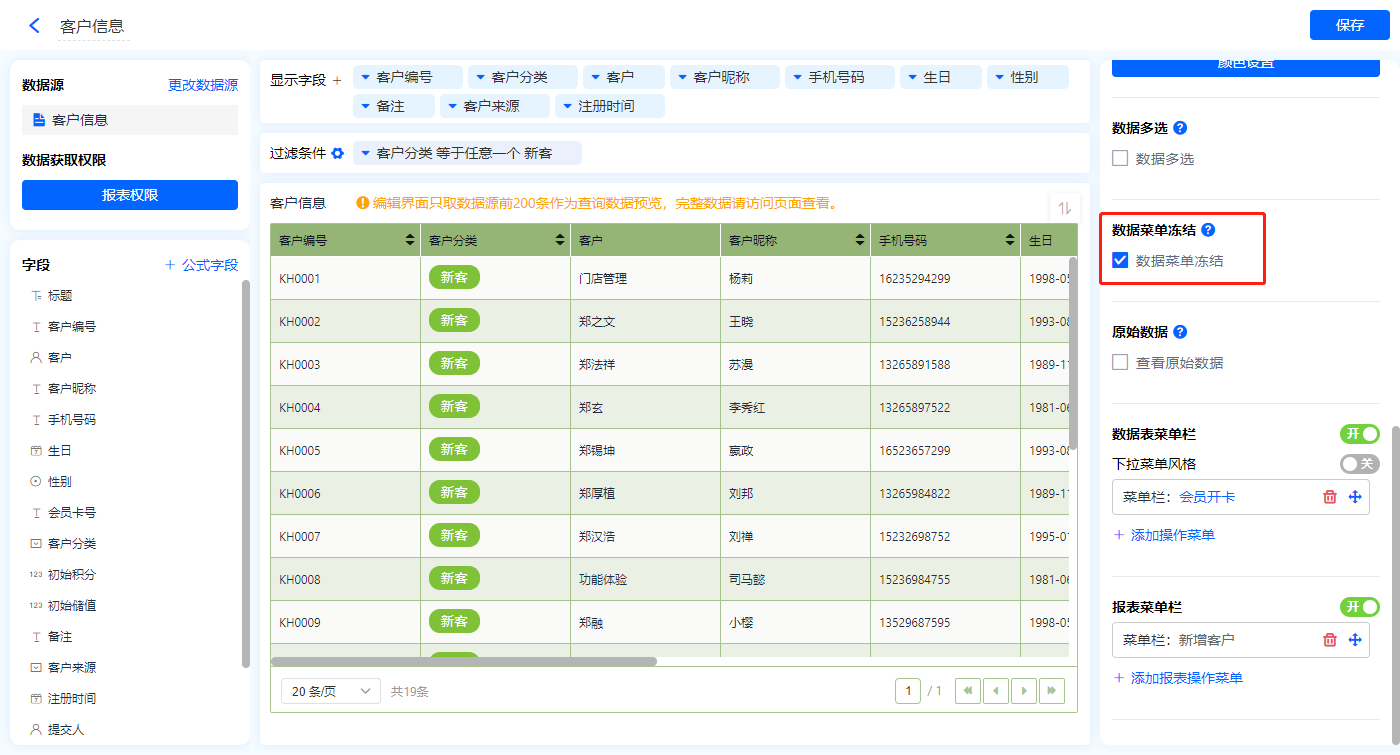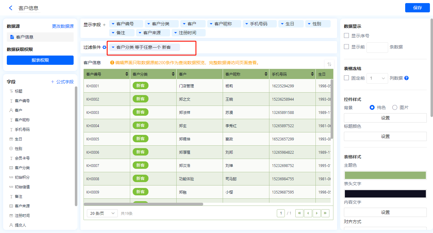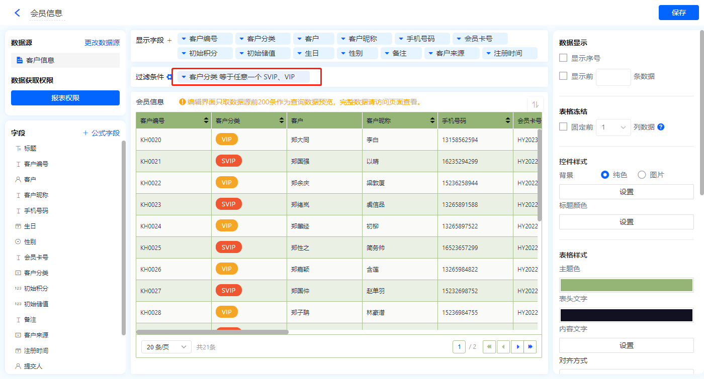 1)新增【会员资料】报表,用基础报表【数据表】展示数据源为表单【客户信息】的数据;