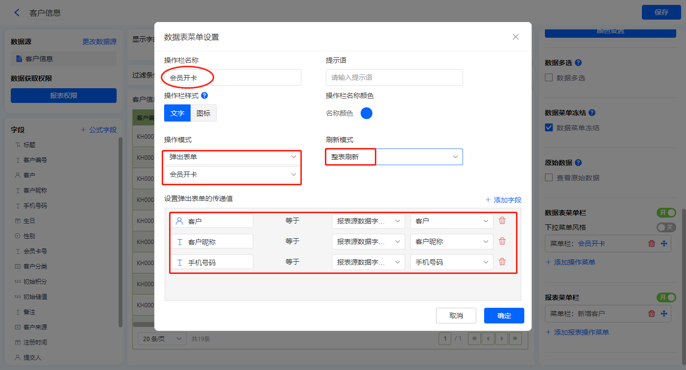 【会员开卡】的菜单栏,操作模式设置为弹出表单【会员开卡】;