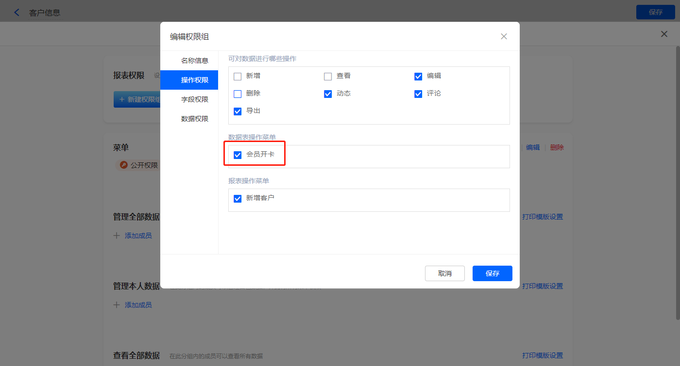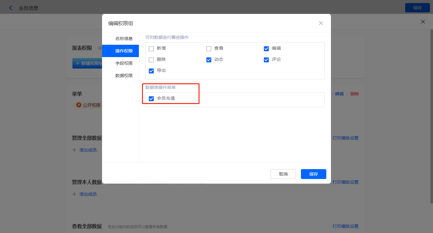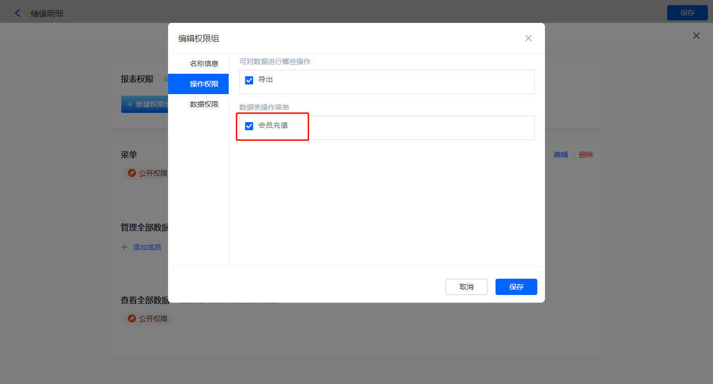 3)设置报表的权限,填入权限组名称,选择可操作的数据表菜单,点击【保存】;