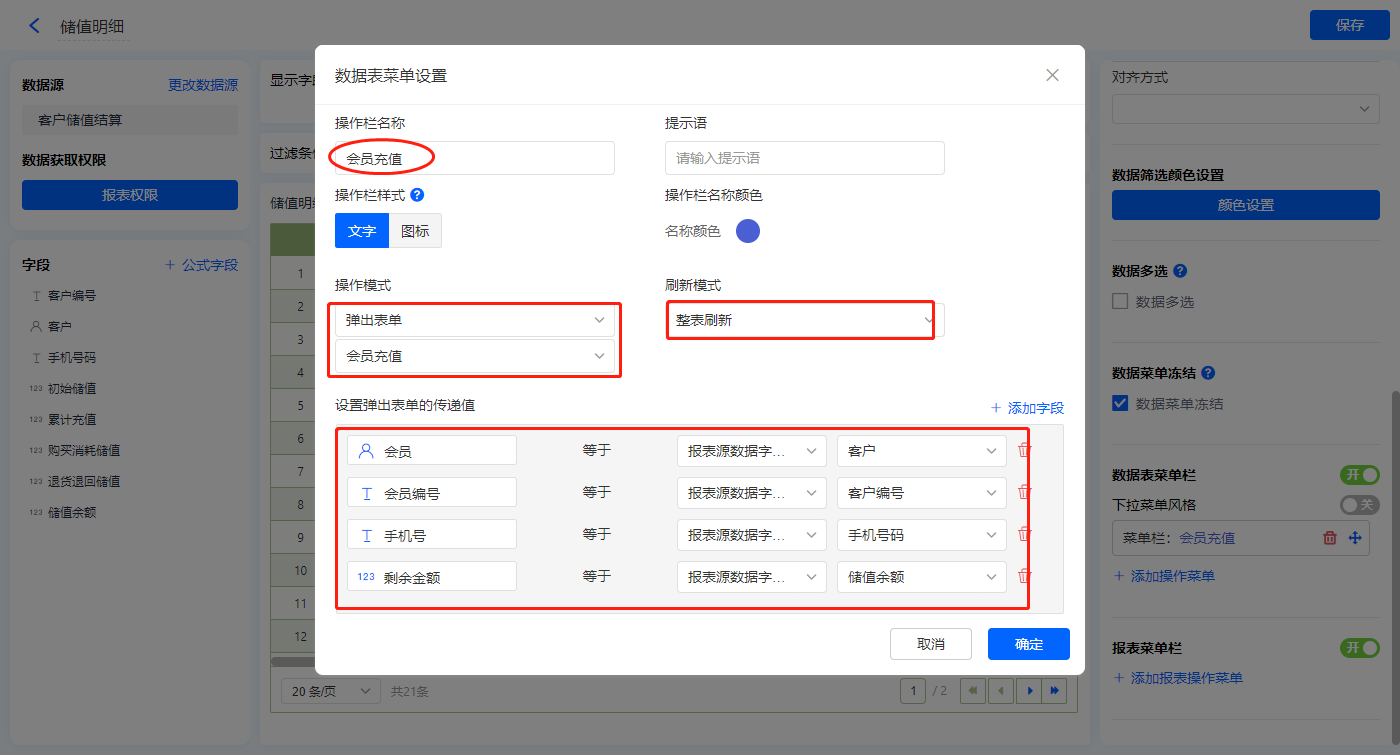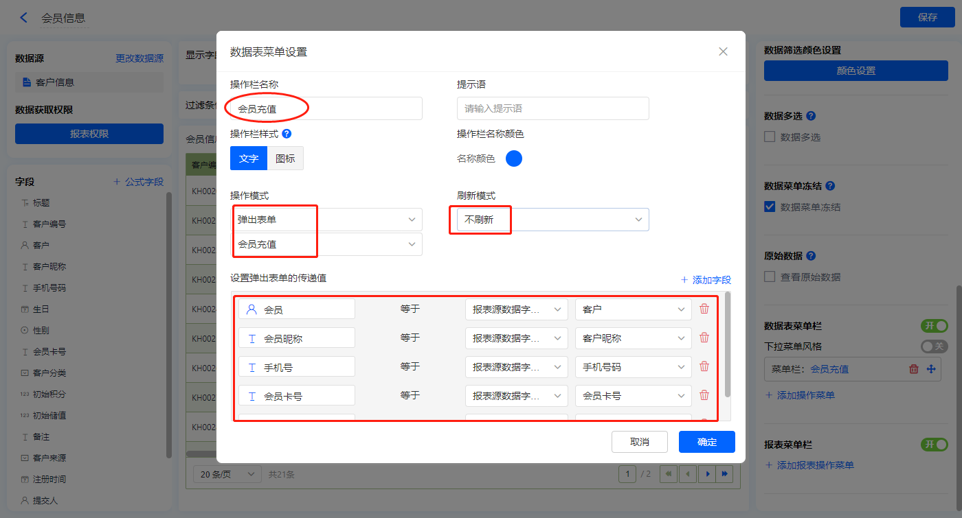 【会员充值】的菜单栏,操作模式设置为弹出表单【会员充值】;