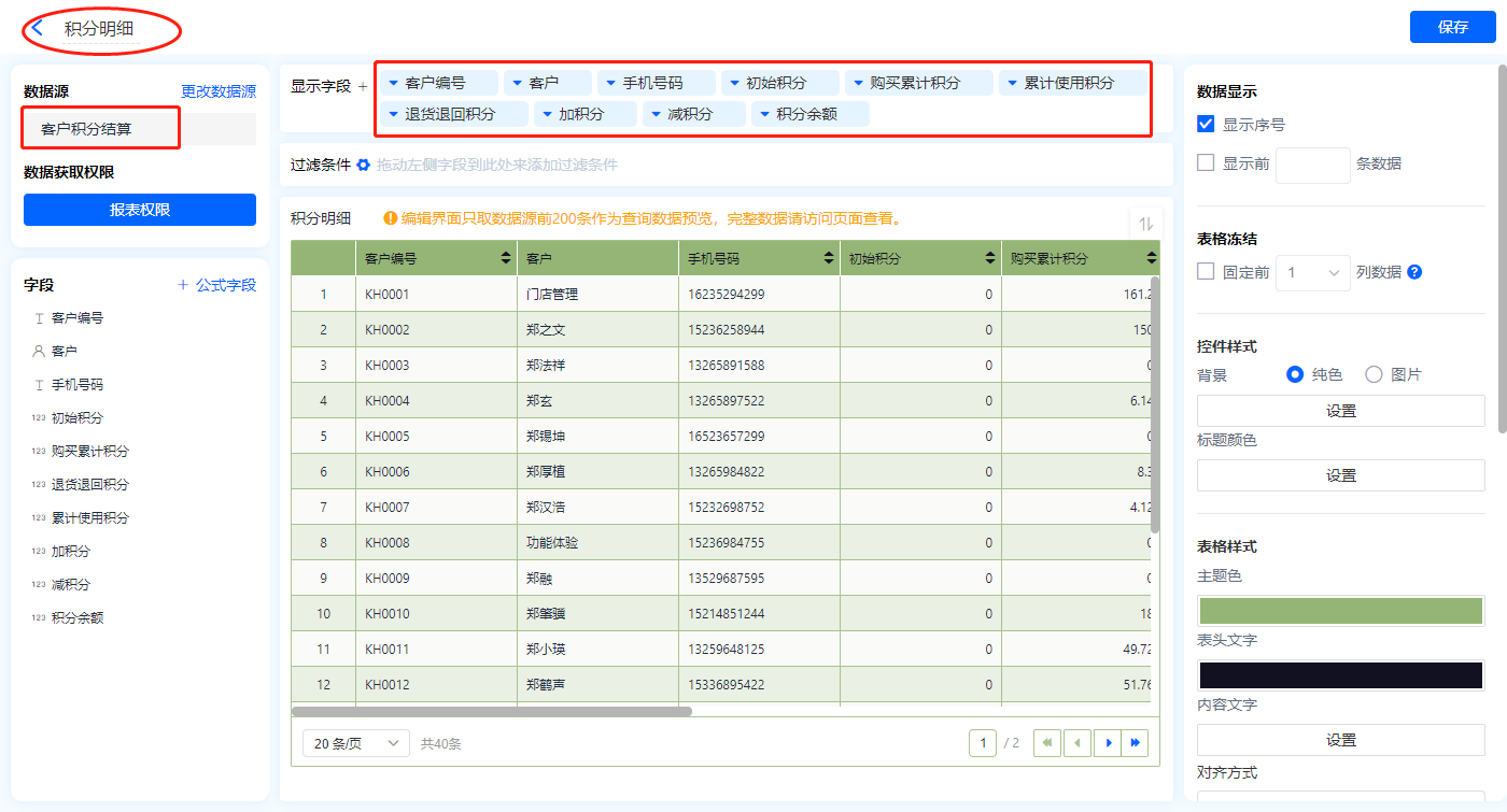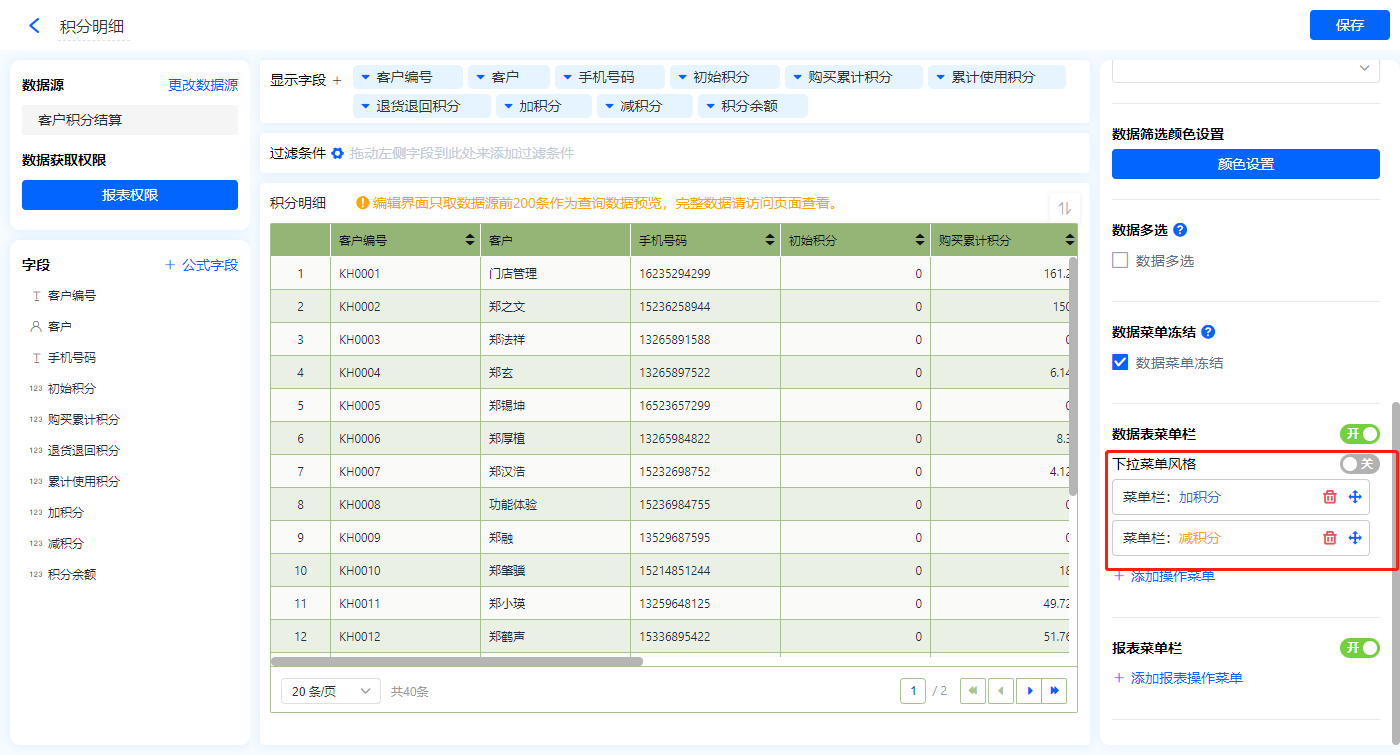 1)新增【积分管理】报表,用基础报表【数据表】展示数据源为聚合表【客户积分结算】的数据;