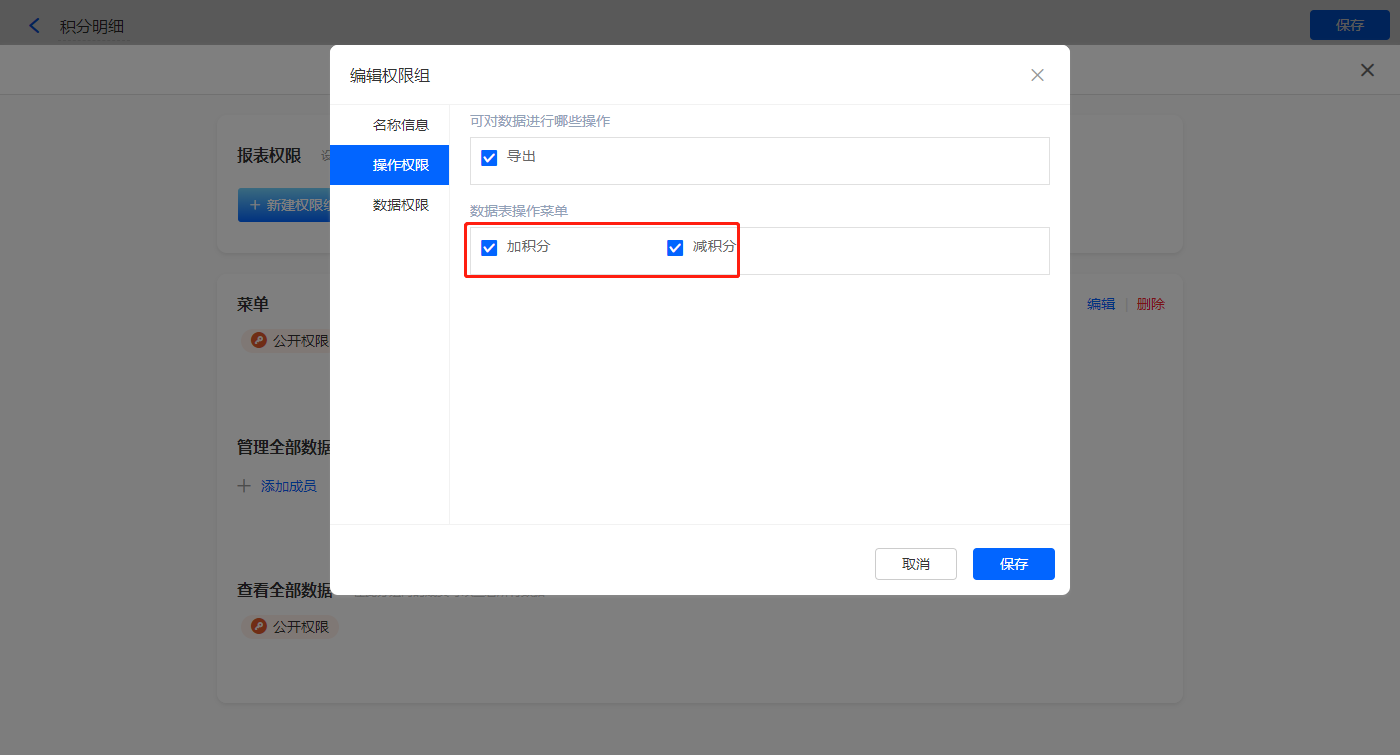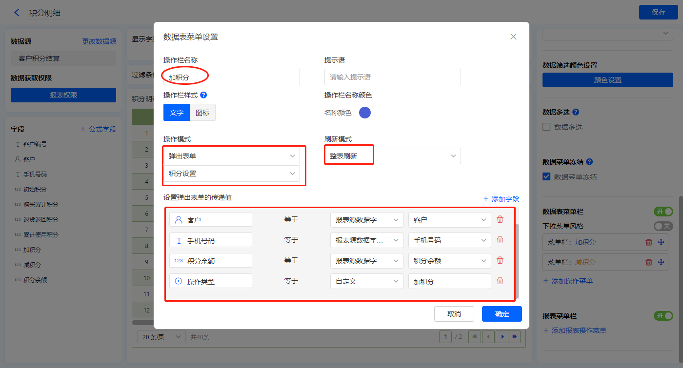 【加积分】的菜单栏,操作模式设置为弹出表单【积分设置】;