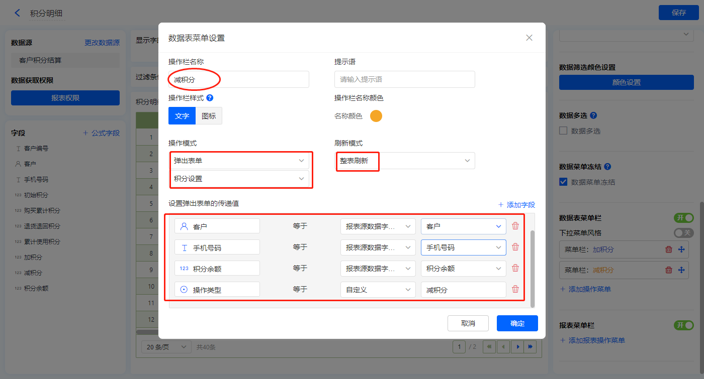 【减积分】的菜单栏,操作模式设置为弹出表单【积分设置】;