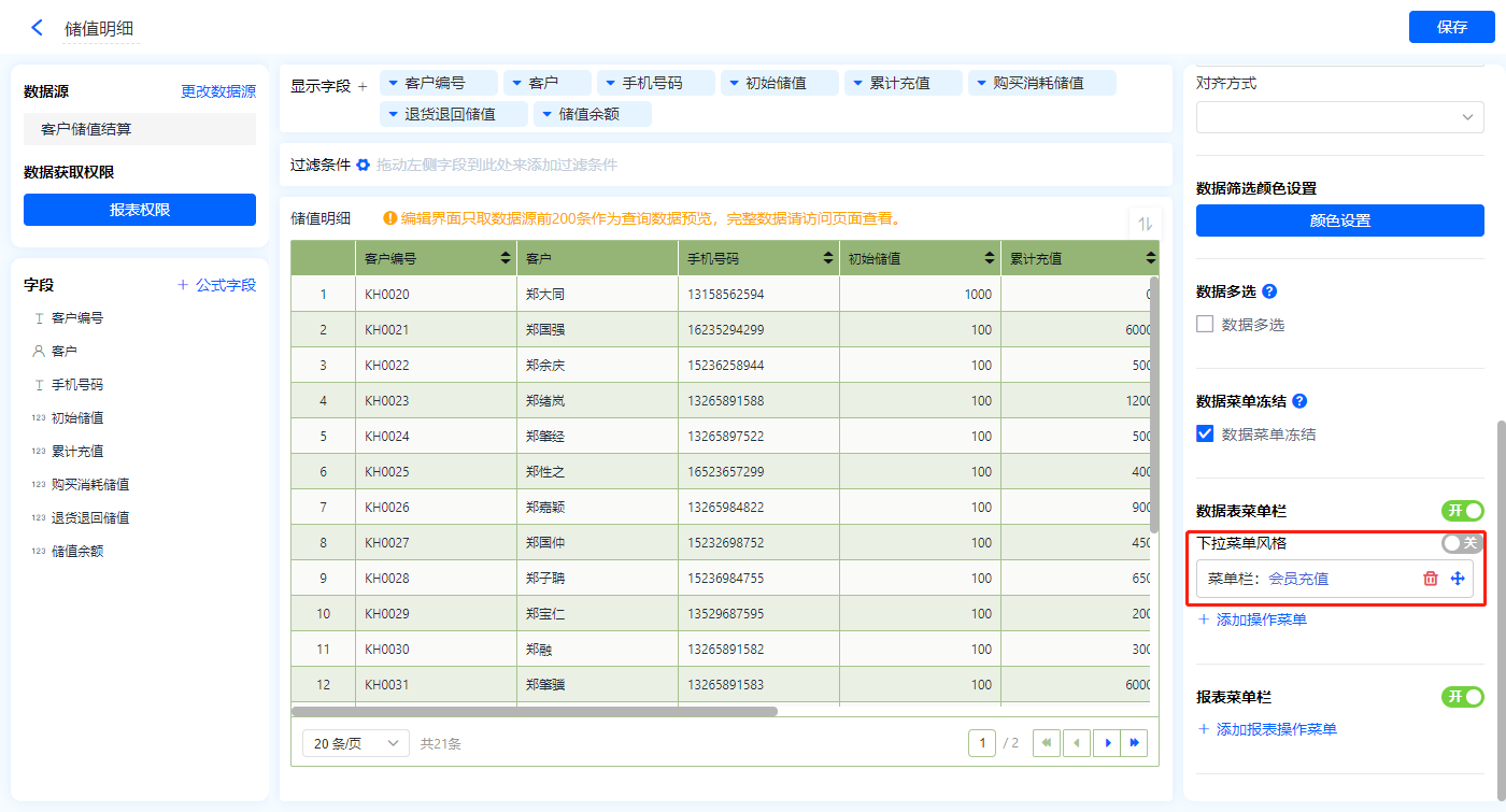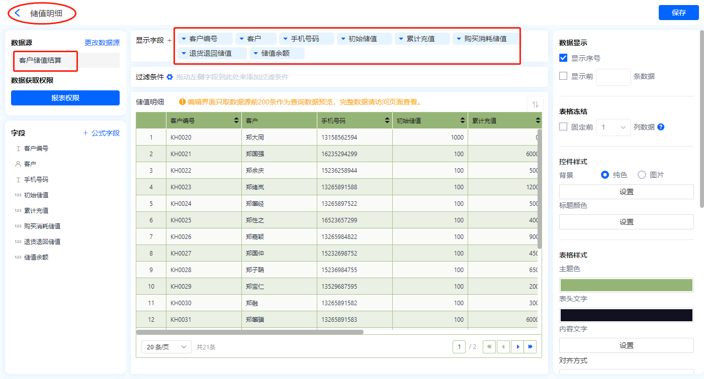 1)新增【储值管理】报表,用基础报表【数据表】展示数据源为聚合表【客户储值结算】的数据;