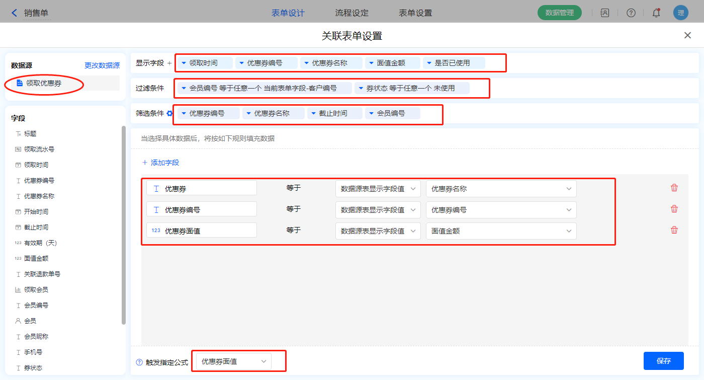 【选择优惠券】数据加载字段,数据源为【领取优惠券】,添加过滤条件及设置赋值字段,触发公式为【优惠券面值】字段;