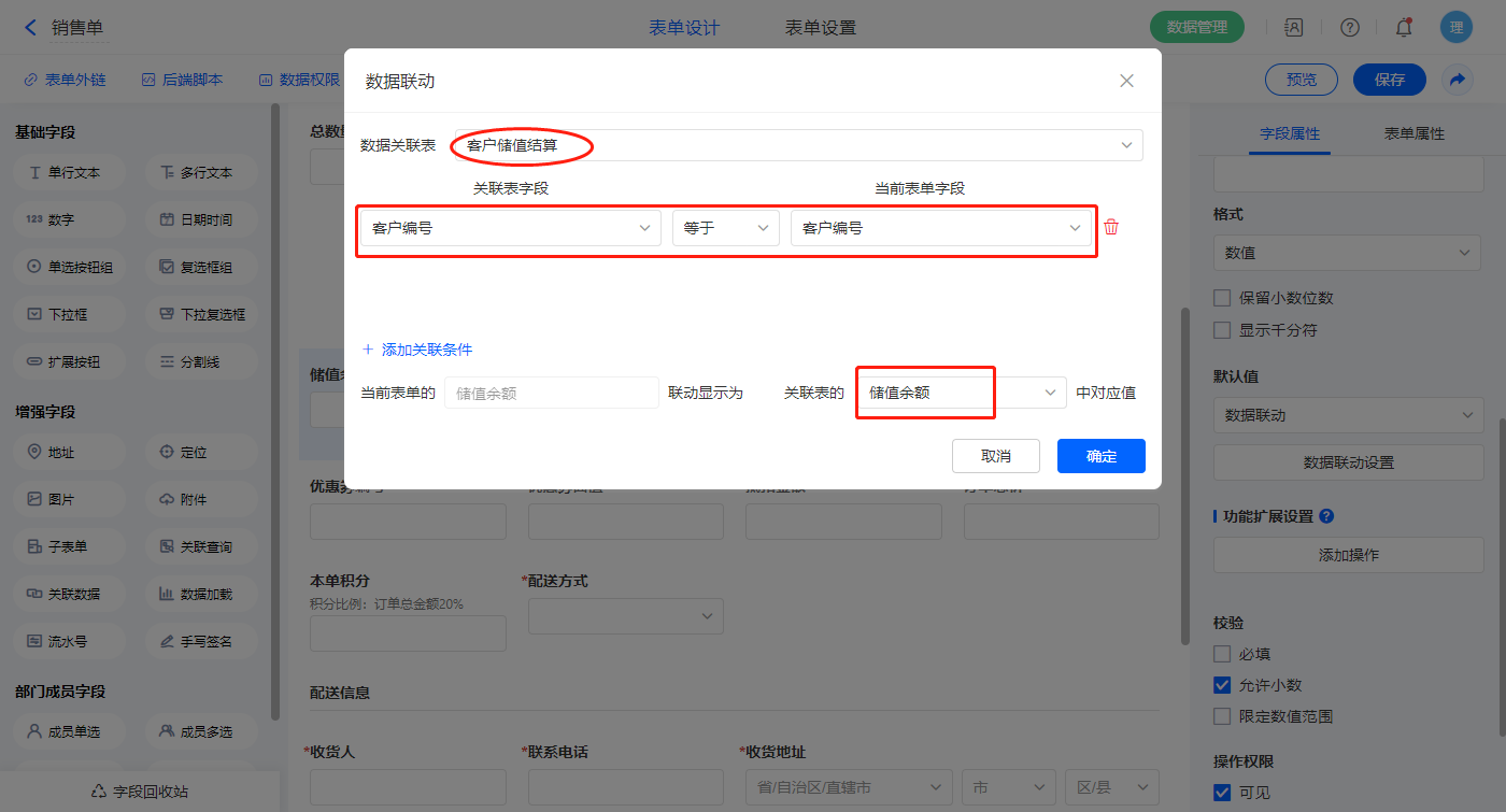 【储值余额】字段,设置默认值为数据联动,设置联动条件及联动字段;