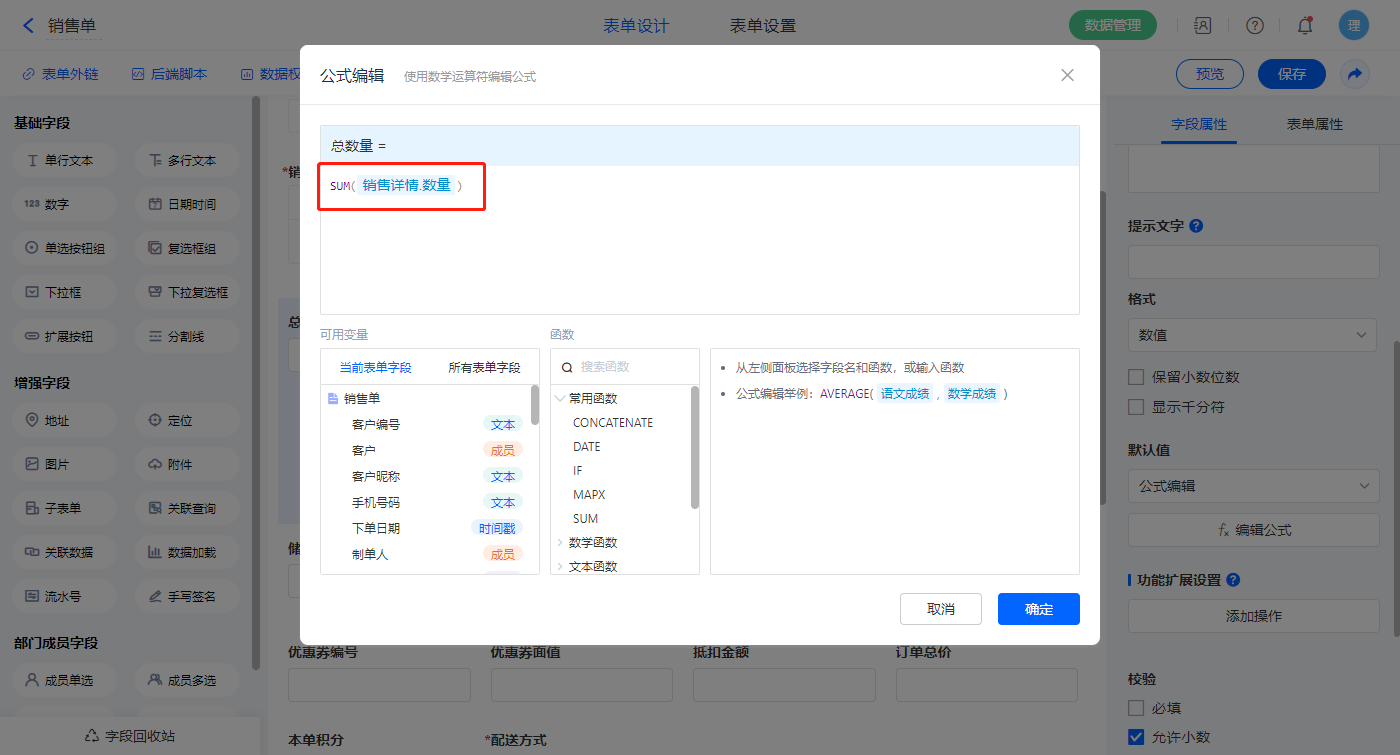 【订单总价】字段,设置默认值为公式编辑,如图设置公式;