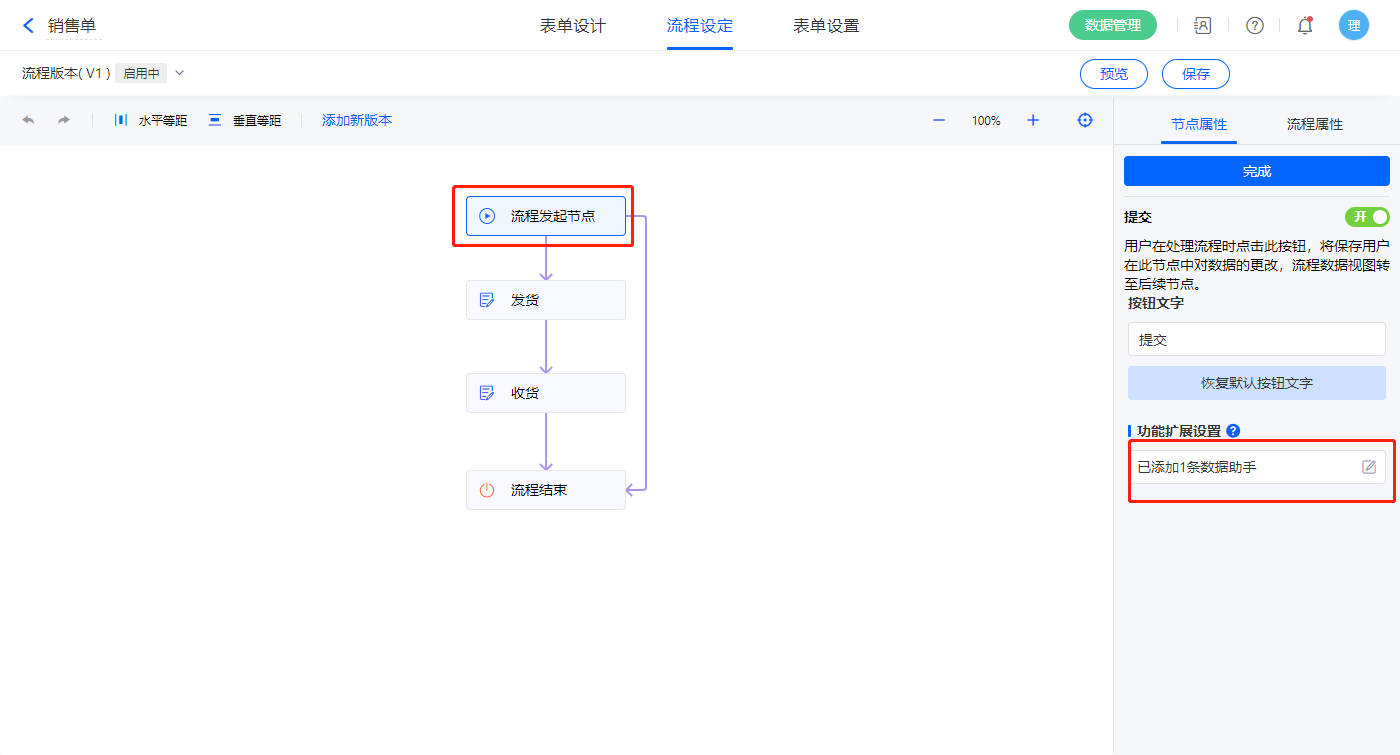 5)该表单为流程表单,设置好流程陈节点,收货节点提交设置一条数据助手,名称为付款流程;