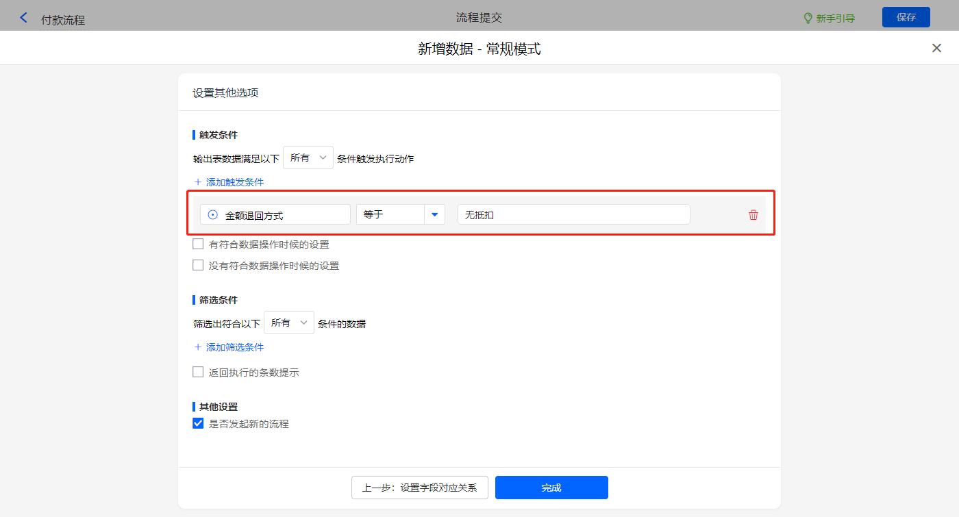 其他设置触发条件为【金额退回方式】等于无抵扣,设置好点击【完成】并保存该数据助手;