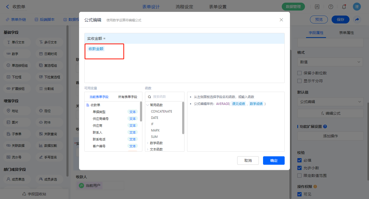 2)【实收金额】字段,默认值选择公式编辑,如图设置公式;