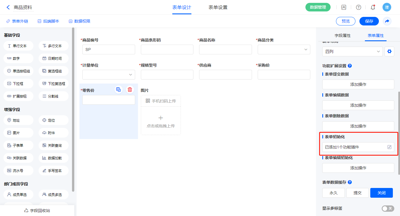 1)表单初始化设置一个功能插件,【自定义流水号】;