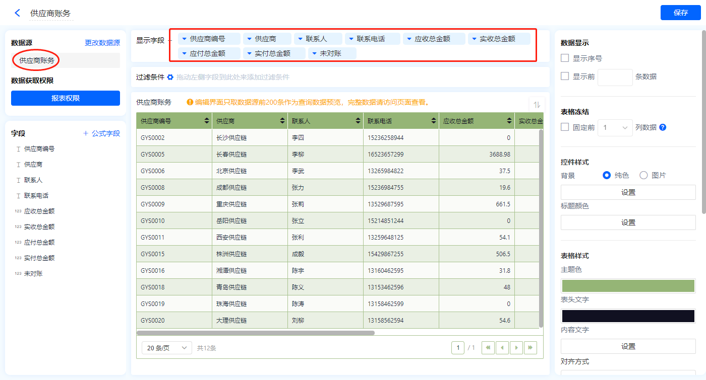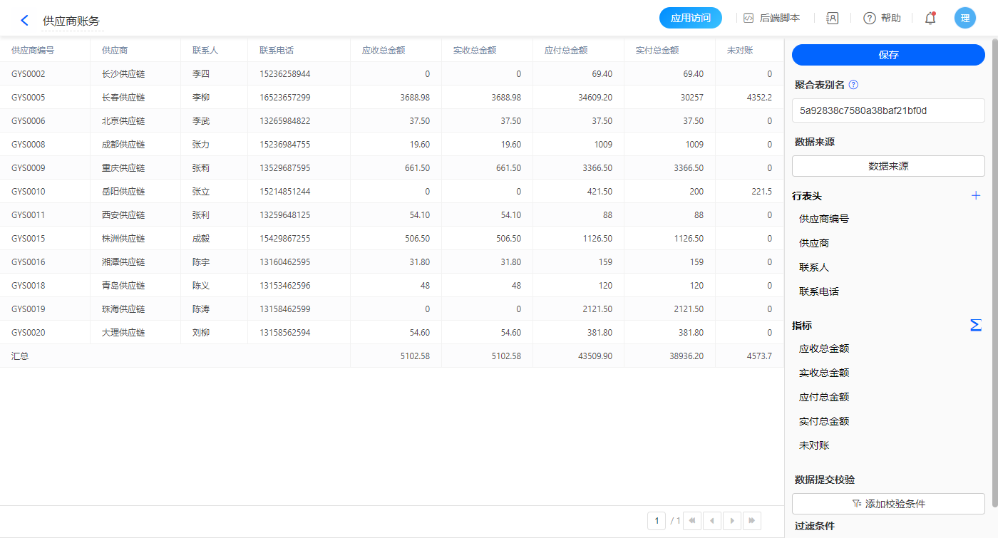 1)新增【供应商账务】报表,用基础报表【数据表】展示数据源为聚合表【供应商账务】的数据;