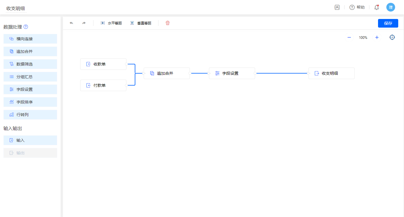 1)新增【收支明细】报表,用基础报表【数据表】展示数据源为视图【收支明细】的数据;