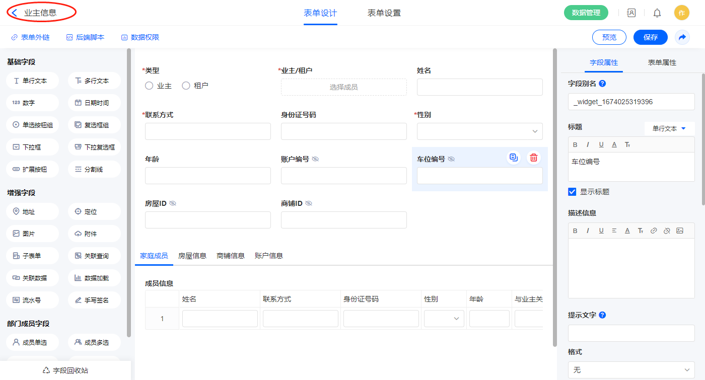 2.2、表单【业主信息】字段及表单属性设置
