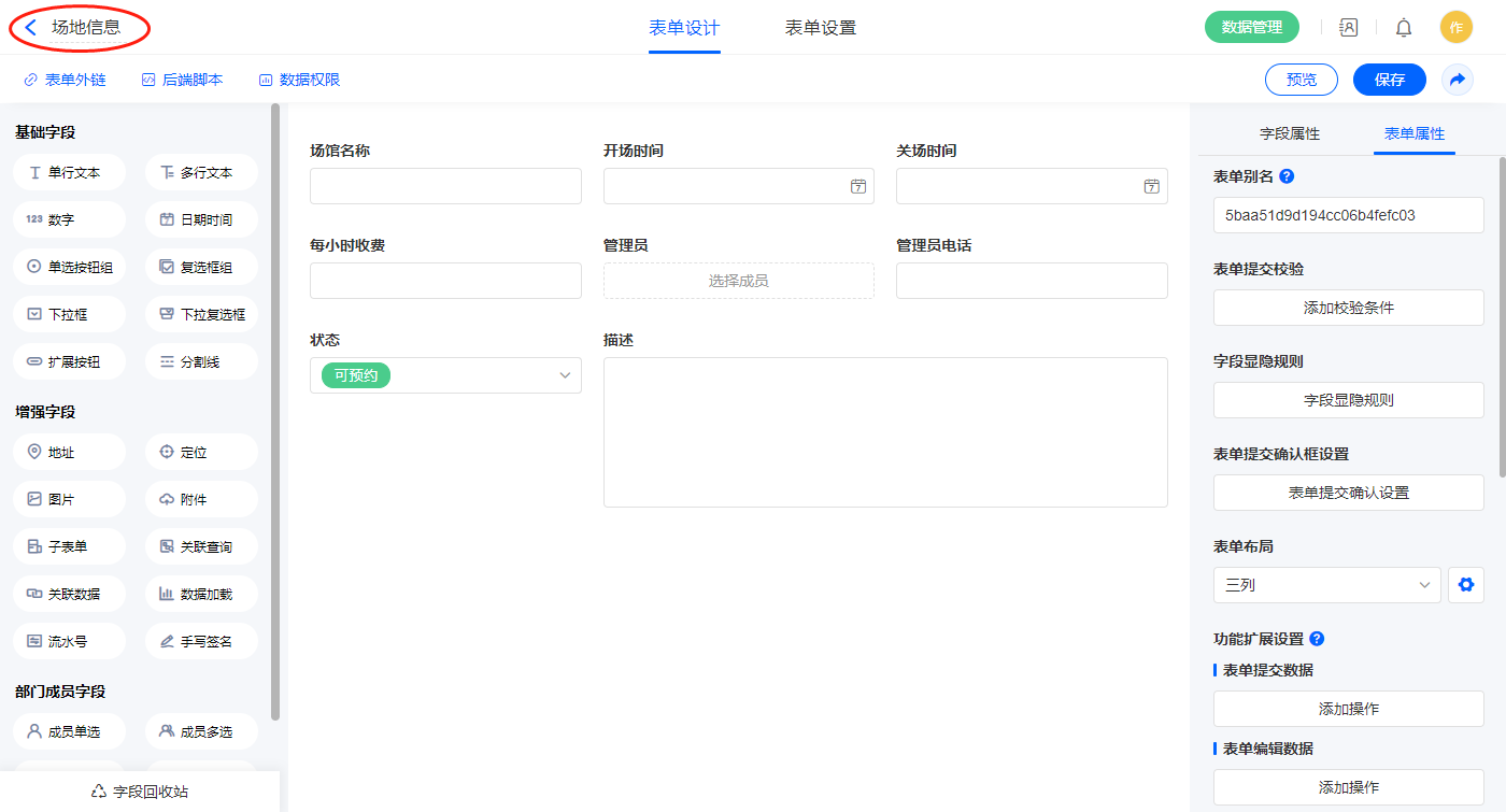 5)新增表单【场地信息】,字段设置如下;
