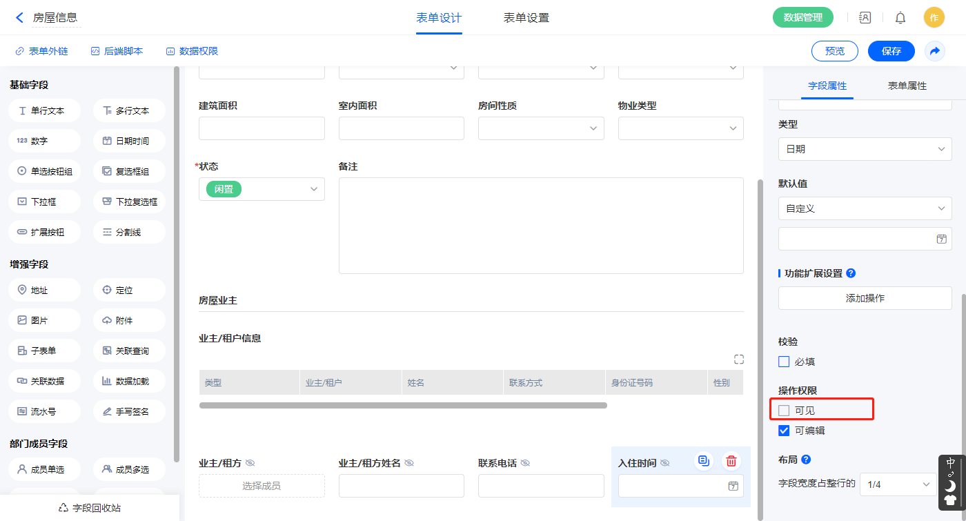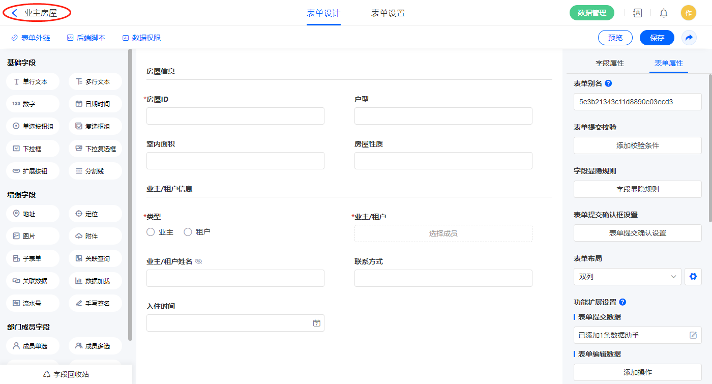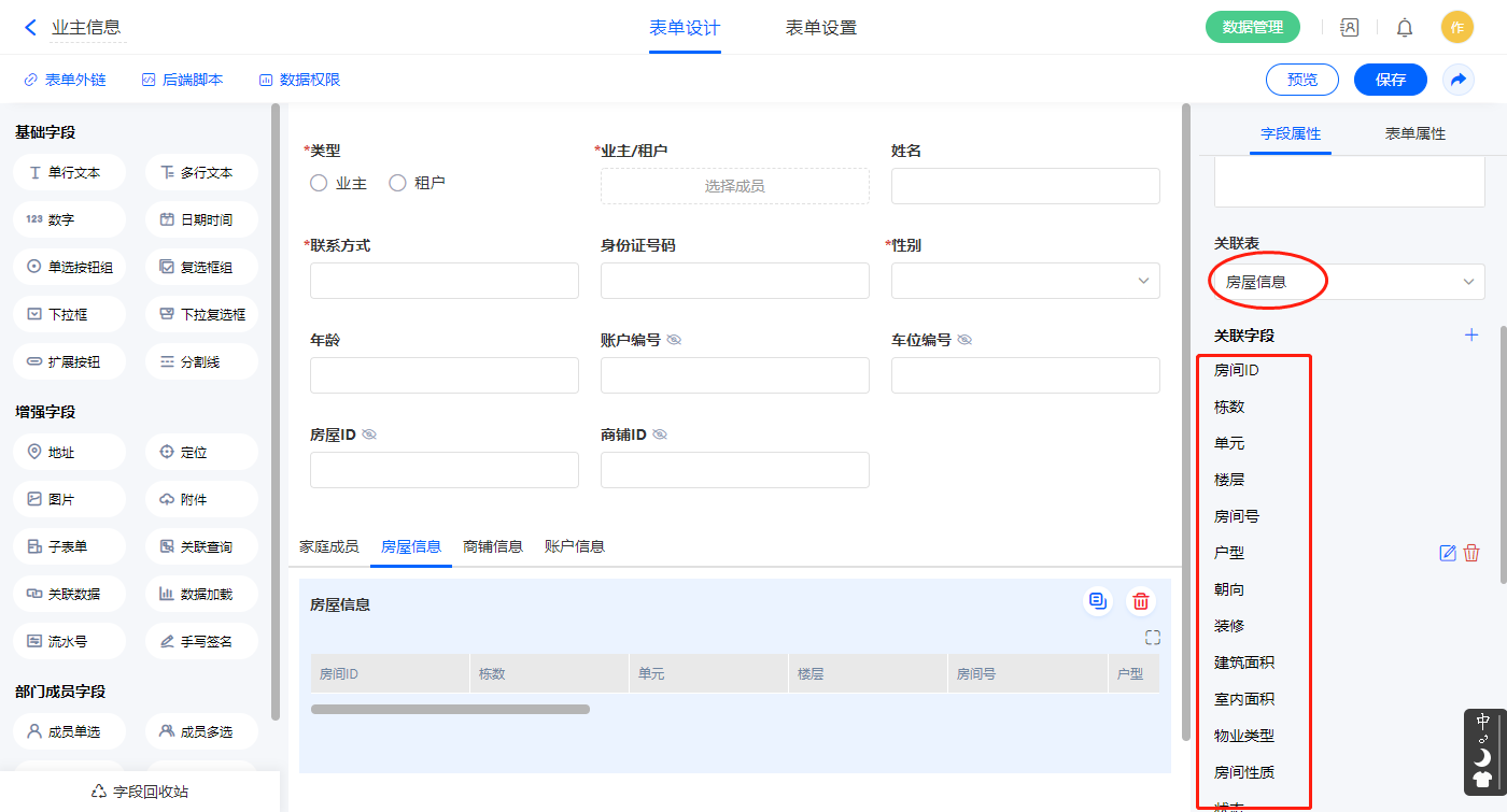 | 业主/租户 | 成员单选 | 房屋ID | 单行文本 |