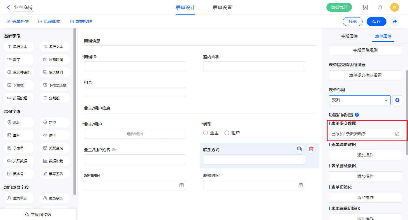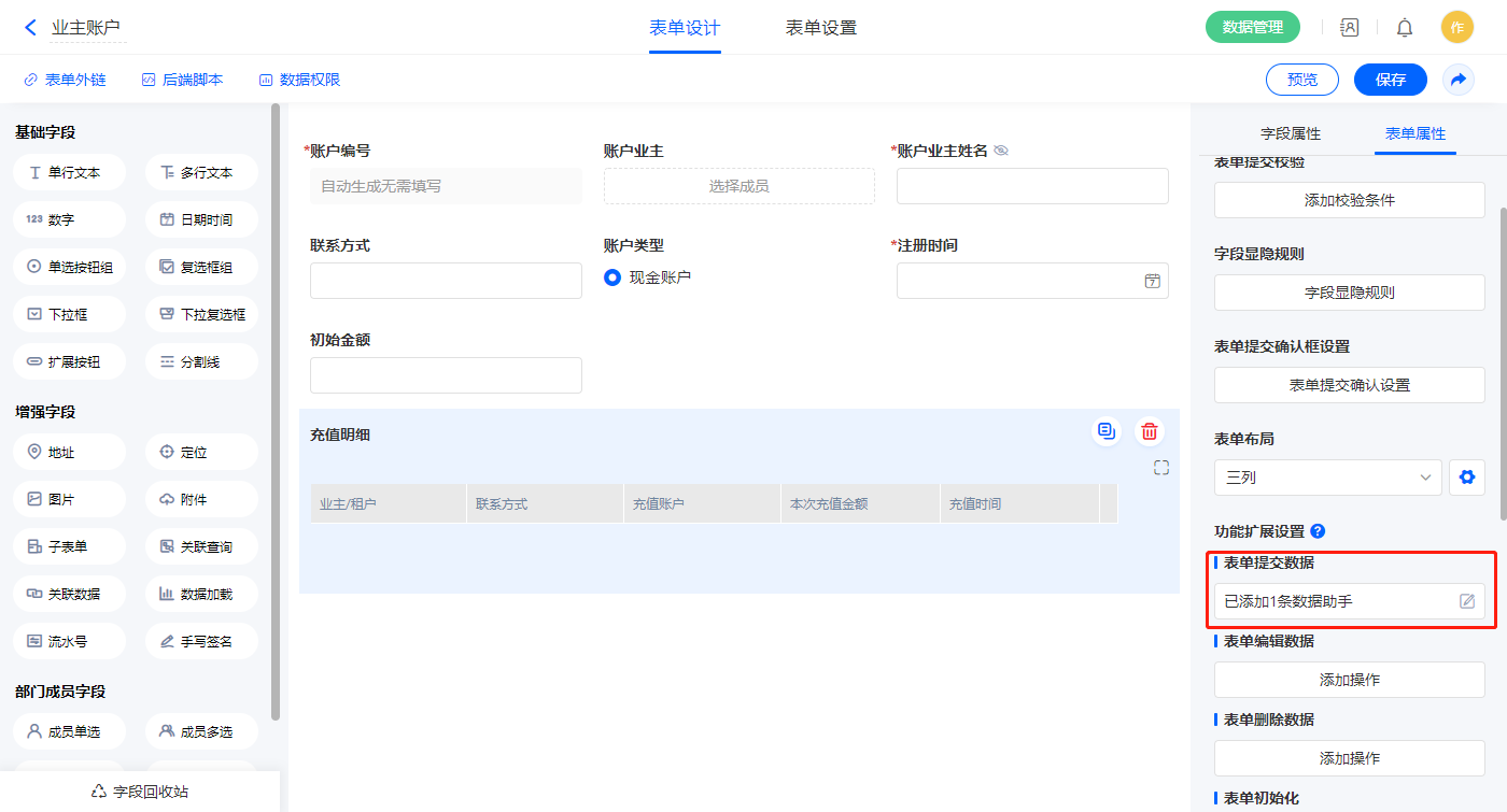 3)表单提交设置1条数据助手,名称为修改业主租户账户信息;