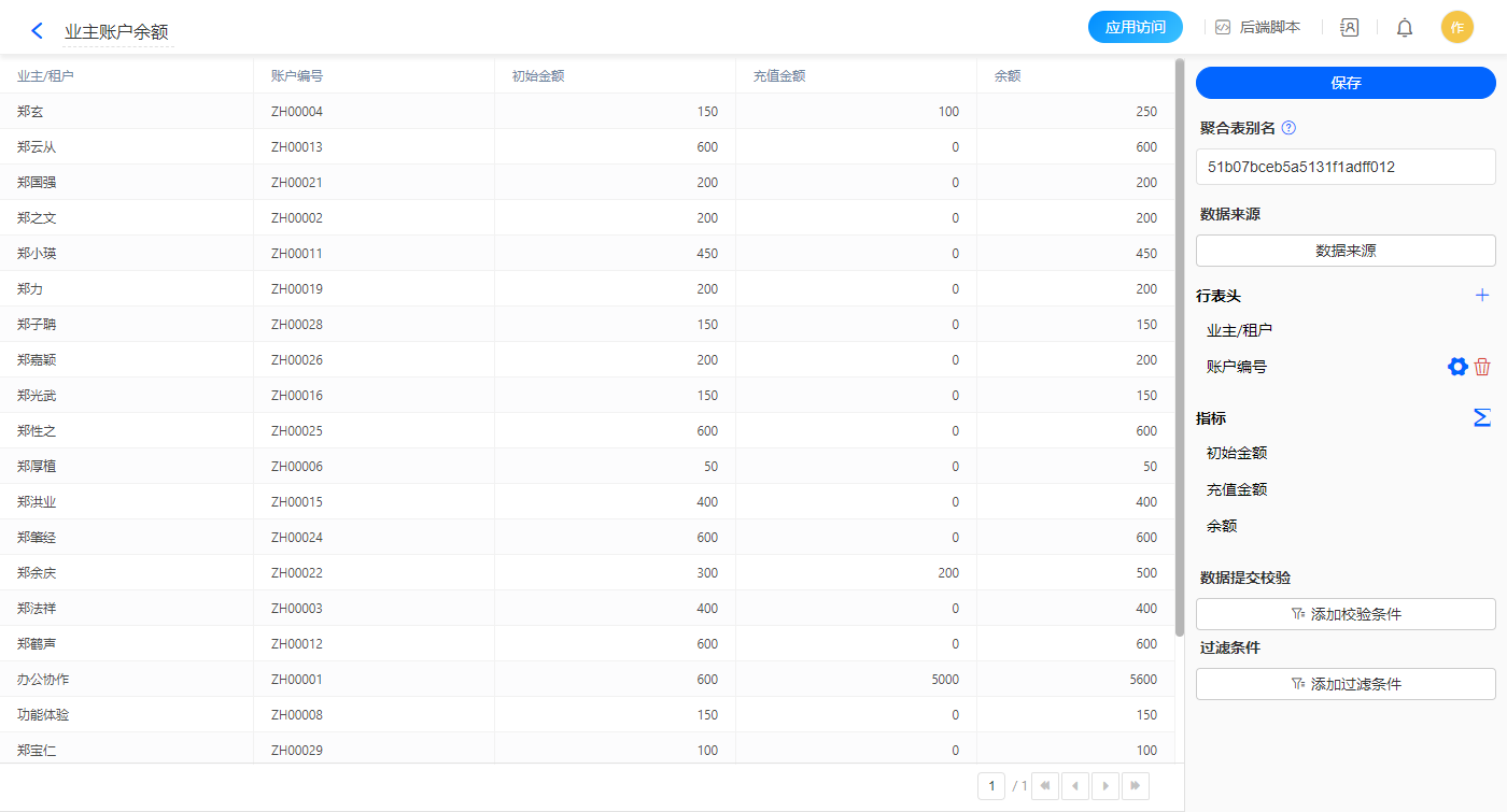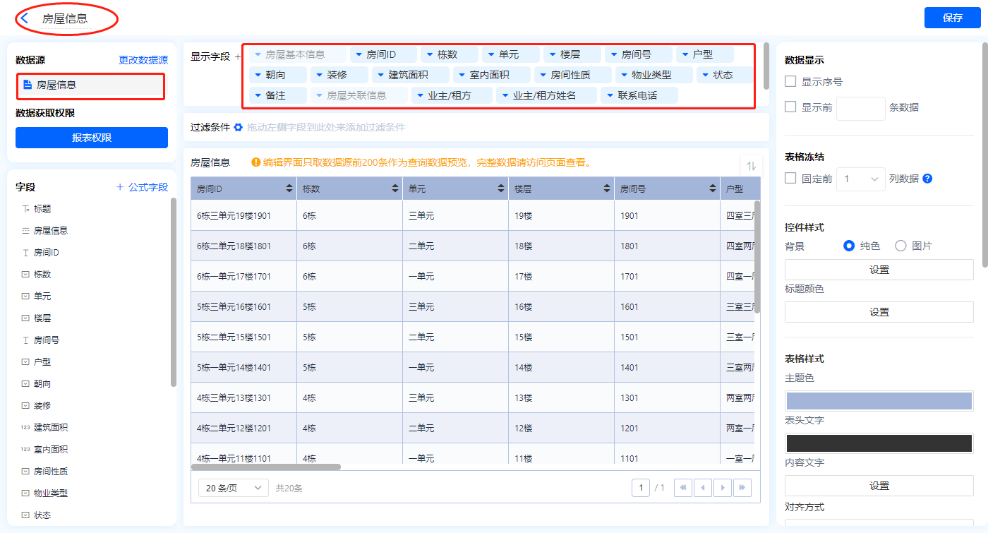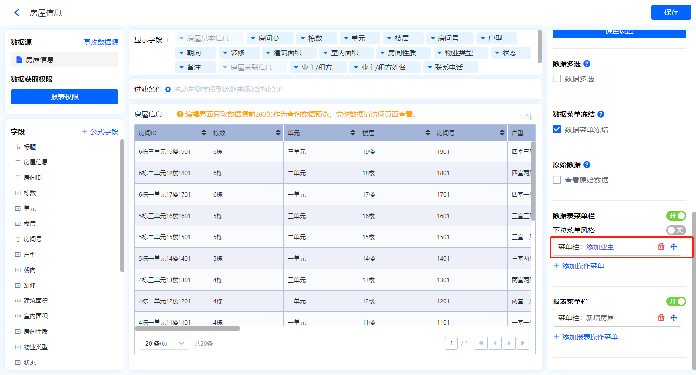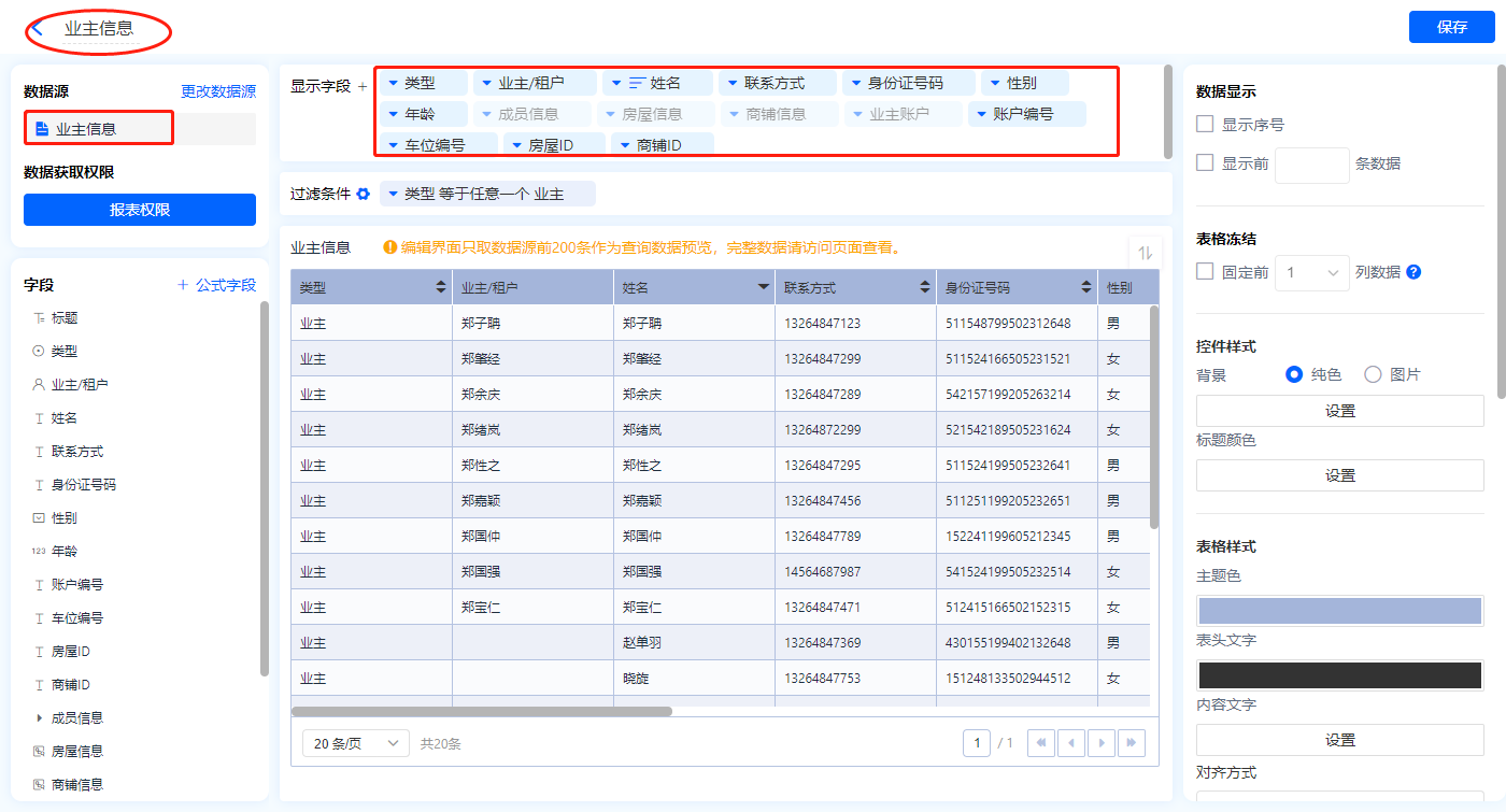 1)新增【业主管理】报表,用基础报表【数据表】展示数据源为表单【业主信息】的数据;