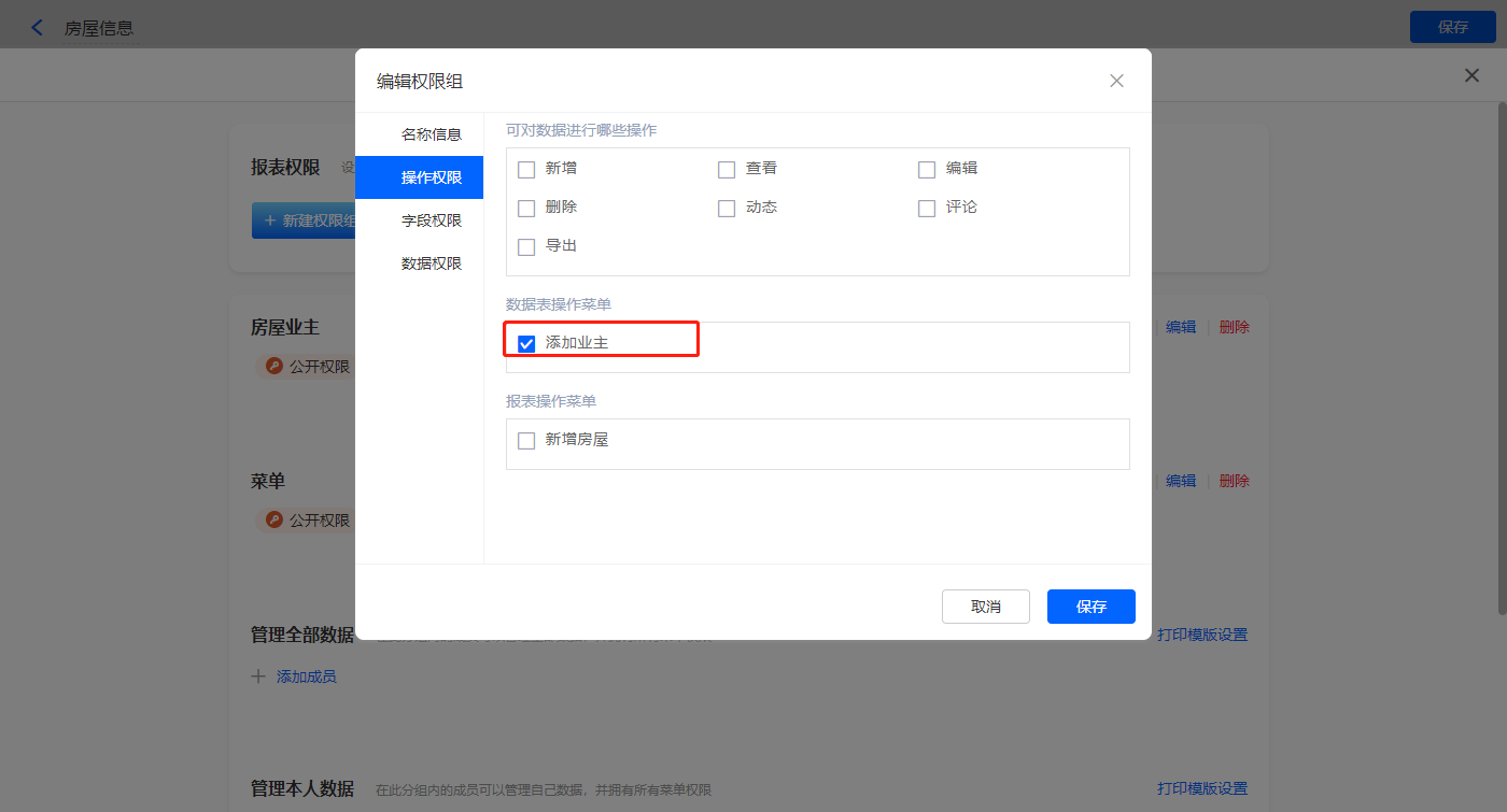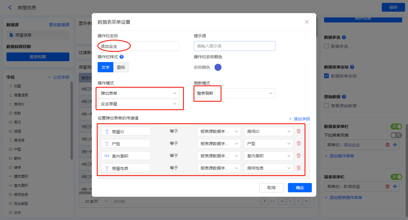 【添加业主】菜单栏,操作模式设置为弹出表单【业主房屋】;