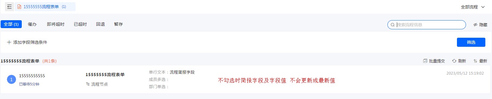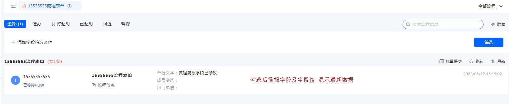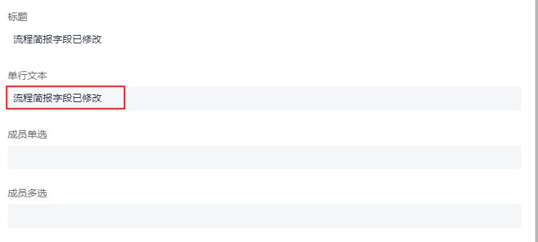 如流程简报中,单行文本的最新值为:流程简报字段已修改。