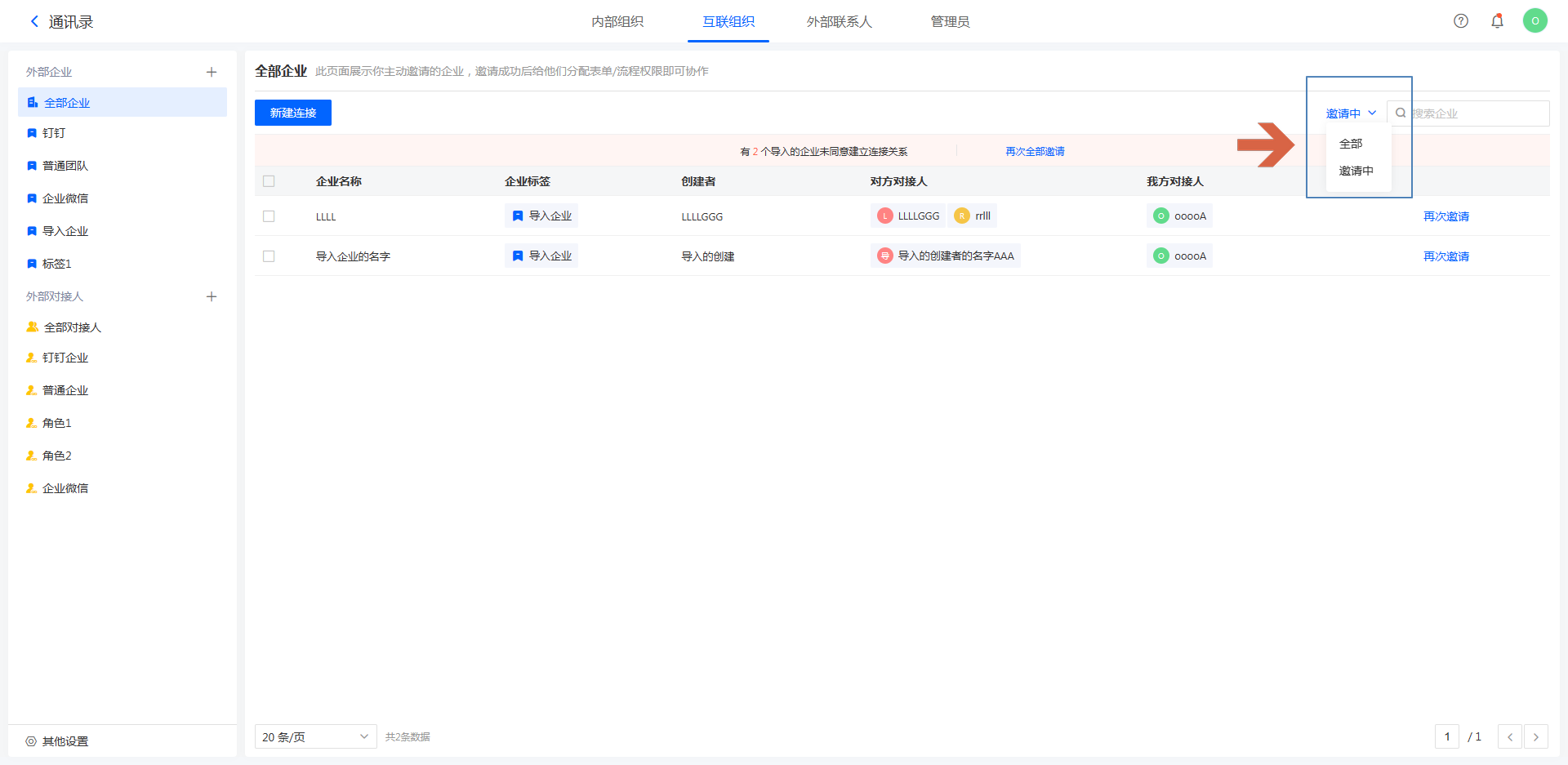 在「我连接的企业」列表中,可以通过分类「邀请中」筛选出目前未连接成功的所有企业。