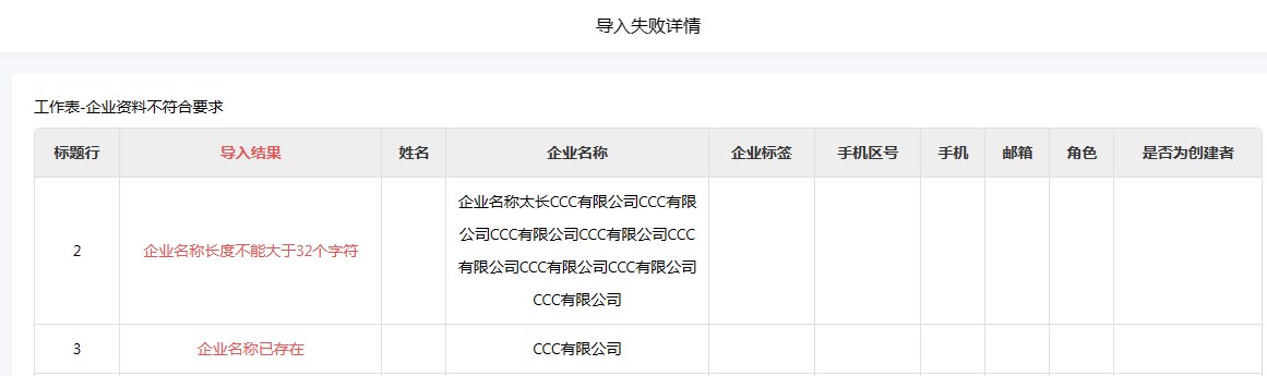 | 企业名称必填 | 成员非创建者,且未填写企业名称,无法确定该成员应该导入到哪个企业名下,故无法导入成功 |