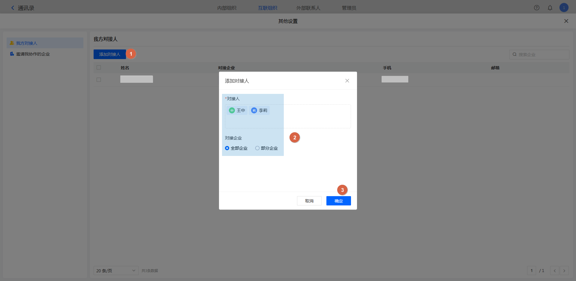 注意:只有内部成员可以设置为对接人,外部联系人不可设置为对接人;即外部联系人不参与企业互联的任何业务。